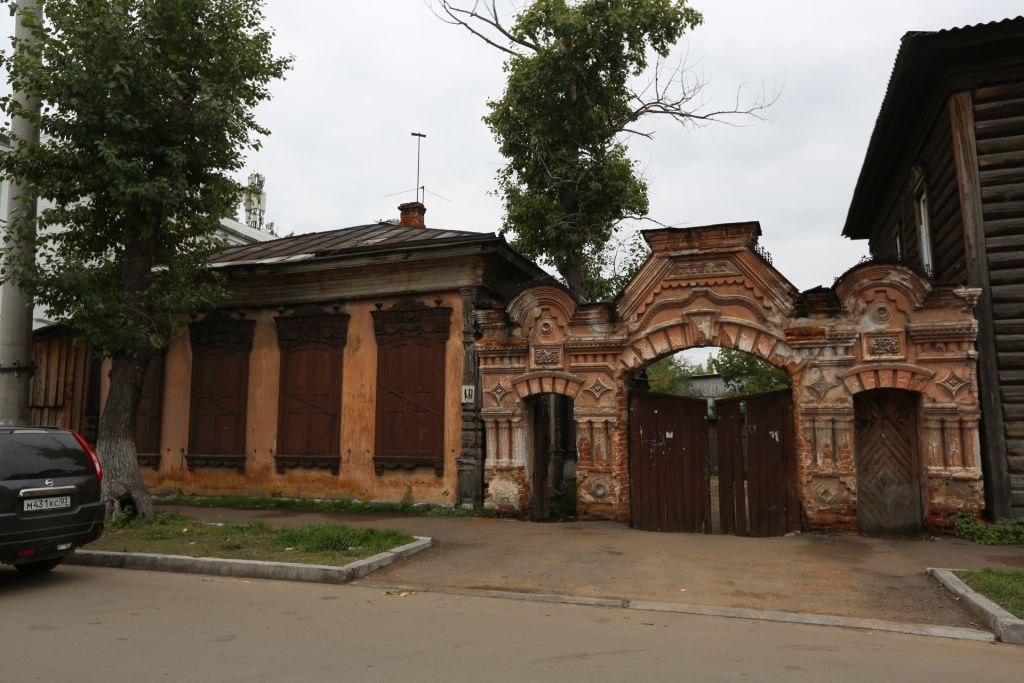 1. Местоположение: На южной стороне ул. Свердлова (быв. Сенная) между её пересечениями с ул. Ленина (Бывш. Большая) и ул. Смолина (быв. Большая Набережная). 2. Объемно-планировочное решение дома:2.1. Этажность: Одноэтажный. 2.2. Планировочное решение: прямоугольное, вытянут вглубь усадьбы, со стороны дворового торцевого фасада примыкает прямоугольный объем, со стороны восточного фасада основного объема устроена открытая галерея. 3. Конфигурация кровли, декор и материал:Сложная, основной объем с вальмами по торцам с южной стороны соединяется с четырехскатной кровлей пристроя, образуя две ендовы. На коньках и ребрах кровли фигурные резные детали из кровельного металла. Галерея под односкатной кровлей. Материал: кровельное листовое железо. 4. Строительные конструкции и материал: наружные стены несущие внутренние стены. Материал: дерево. 5. Декоративные элементы фасадов:5.1. Карниз и фриз, их местоположение, конфигурация, декор, материал. По периметру дома. Профилированный карниз большого выноса с массивной выкружкой, декорированной понизу лентой объемного резного орнамента. Материал: дерево. 5.2. Пилястры, их местоположение, конфигурация, количество, декор и материал. По периметру дома. Конфигурация: 1. Высокий пьедестал; 2. Фигурная лопатка. Декор: Пьедестал: 1.Профилированный карниз декорированный лентой резного орнамента; 2. Профилированный багет по на лицевой части цоколя; 3. Накладной элемент объемной резьбы. Лопатка: 1. Профилированный карниз; 2. Объемная резьба; 3. Накладные элементы объемной резьбы; 4. Ленты резных орнаментов. Количество: 15 (южный - 3, восточный - 5, западный - 5, северный - 2). 5.1. Оконные проемы тип 1, их местоположение, конфигурация, количество, расстекловочная схема и конфигурация оконных заполнений. По периметру дома. Конфигурация оконных проемов: с лучковым завершением. Оконные заполнения: конфигурация - с лучковым завершением. Расстекловочная схема - трёхстекольная. Кол-во: 16 (южный - 2, восточный - 4, западный - 6, северный - 4). 5.2. Оконные проемы тип 2, их местоположение, конфигурация, количество, расстекловочная схема и конфигурация оконных заполнений. Южный и восточный фасады пристроя. Конфигурация оконного проема: прямоугольный, меньших размеров, чем тип 1. Оконное заполнение: конфигурация - прямоугольный. Расстекловочная схема -трёхстекольная. Кол-во: 3 (южный - 2, восточный - 1). 5.3. Наличники тип 1, их местоположение, конфигурация, декор, материал. Южный, северный и западный фасады. Четырехсторонний с фигурной нижней частью. 1)Декор лобани: 1. Профилированный карниз, декорированный лентой резного орнамента. 2. Вертикальные фигурные элементы, разрывающие нижнюю часть карниза (п.п.1.), декорированы объемными пирамидальными элементами. 3. Фигурный элемент объемной резьбы, между вертикальными элементами (п.п. 2). 4. Вертикальные элементы, раскреповывающие карниз. Вертикальные элементы в средней части декорированы фигурными элементами объемной резьбы, внизу профилированные с четырьмя трапециевидными элементами объемной резьбы. 5. Полукруглый элемент, идентичный карнизу (п.п.1), в центре декорирован полукруглым элементом объемной резьбы. 6. Акротерии по бокам полукруглого элемента (п.п.5). 7. Фигурные элементы, венчающие вертикальные элементы (п.п.4). 8. Поясок декорированный резным орнаментом. 9. Накладной элемент рельефной резьбы типа «Полотенц