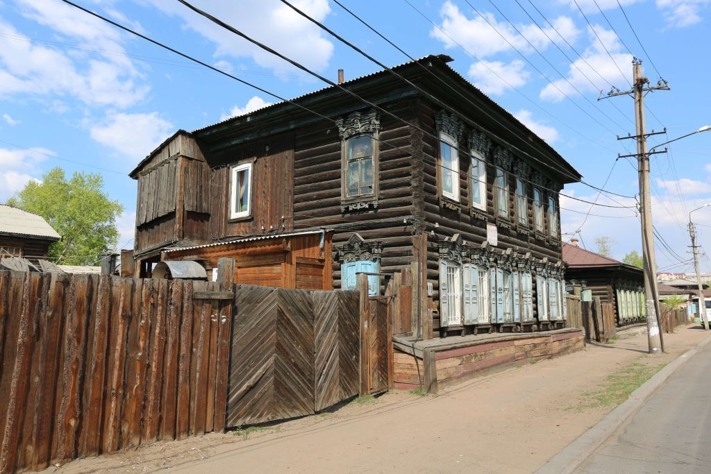 1. Местоположение: на северной стороне ул. Банзарова, между её пересечениями с ул. Ленина и ул. Коммунистическая.2.Объемнопланировочное решение здания2.1. Этажность: двухэтажное2.2. Планировочное решение: прямоугольный, протяженным южным фасадом отнесен к красной линии улицы. К зданию с северной стороны, во всю длину фасада примыкает двухэтажная галерея, с выступающим из контура плана здания западным торцом.3. Конфигурация кровли: вальмовая, галерея - односкатная.4. Строительные конструкции и материал:наружные стены несущие внутренние стены. Материал: дерево5. Декоративные элементы фасадов:5.1 Карниз его местоположение, конфигурация, материалПо периметруПрофилированный, подшивной карниз большого выноса. Материал: дерево.5.2. Фриз его местоположение, конфигурация, материалЮжный, восточный и западный фасадыВ виде двух накладных досок, уложенных горизонтально. Материал: дерево.5.3. Оконные проемы, их местоположение, конфигурация, количество и расстекловочная схема и конфигурация оконных заполненийЗападный, восточный и южный фасадыКонфигурация оконных проемов: с лучковым завершением. Оконные заполнения: конфигурация - с луковым завершением, расстекловочная схема -пятистекольная. Кол-во: 18 (южный -12, восточный - 4, западный -2).5.4. Оконный проем, его местоположение, конфигурация, расстекловочная схема и конфигурация оконного заполненияСеверная часть западного фасада, второй этажКонфигурация оконного проема: меньших размеров, с лучковым завершением. Оконное заполнение: конфигурация - с луковым завершением, расстекловочная схема -пятистекольная.5.5. Наличники их местоположение, конфигурация, количество, декор, материал.Западный, восточный и южный фасады.Четырехсторонний. 1 ) Декор лобани: 1. Профилированный карниз, декорированный двумя рядами сухариков 2. Вертикальный элемент в оси лобани, разрывающий карниз. Вертикальный элемент в средней части декорирован круглой «солярной» деталью объемной резьбы, внизу профилированный с тремя трапециевидными элементами объемной резьбы. 3. Двускатный карниз, венчающий вертикальный элемент (п.2.), идентичный общему карнизу лобани. 4. Боковые вертикальные элементы, раскреповывающие карниз, расположенные в осях боковых частей наличника. Вертикальные элементы в средней части декорированы пирамидальными деталями объемной резьбы, внизу фигурные. 5.Треугольные акротерии, венчающие вертикальные элементы (п.4.), плоскость акротерии в верхней части декорирована прямоугольным пояском. 6. Свесы карниза (п.1.) из объемных прямоугольных и фигурных элементов. 7. «Солярные» детали объемной резьбы (2 шт.), по полю лобани, между вертикальными элементами (п.2. и п. 4.). 8. Накладная доска по полю лобани (2 шт.), над «солярными» деталями (п.7.), в нижней части дугообразная, профилированная. 2) Декорнижней части наличника: 1. Прямоугольный пояс по периметру.2. Элементы объемной резьбы по нолю.3. Свесы фигурные.4. Фигурный элемент пропильной резьбы ажурного рисунка. Материал: дерево. Кол-во: 18 (южный -12, восточный - 4, западный - 2).5.6.Ставни их местоположение, конфигурация, количество и материалЗападный, восточный и южный фасада.,Ставни двухстворчатые, филенчатые, трехчастные. Верх ставень повторяет конфигурацию завершения оконного проема.Материал: дерево.Кол-во 8 (южный-6, восточный-1, западный-1 ).