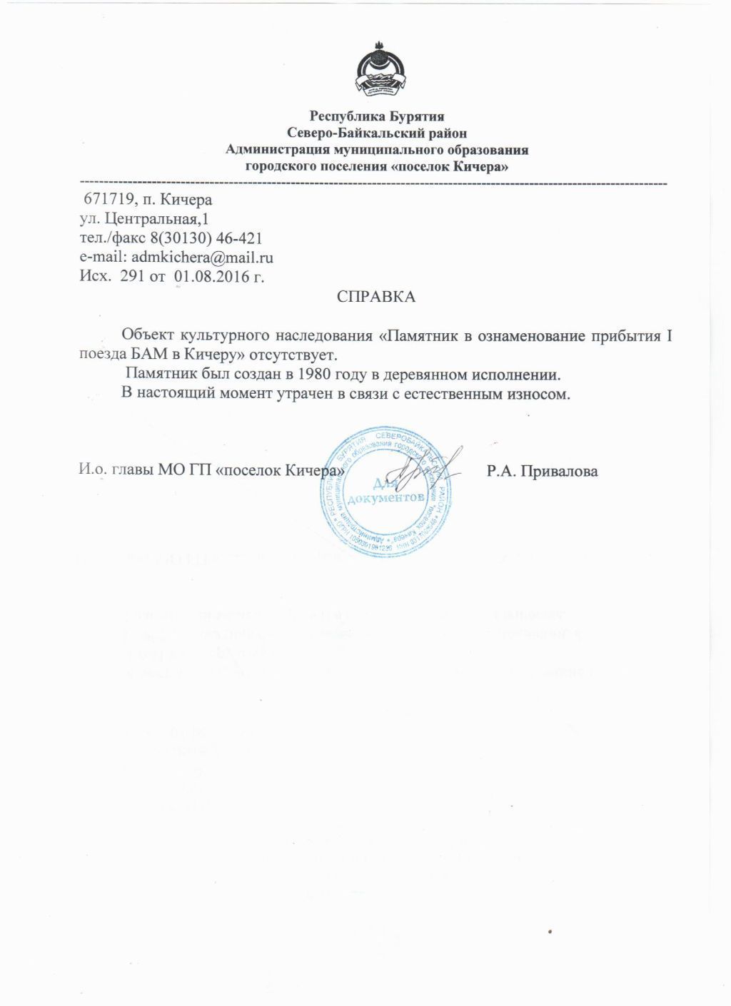 Памятник в ознаменование прибытия I поезда БАМ в Кичеру