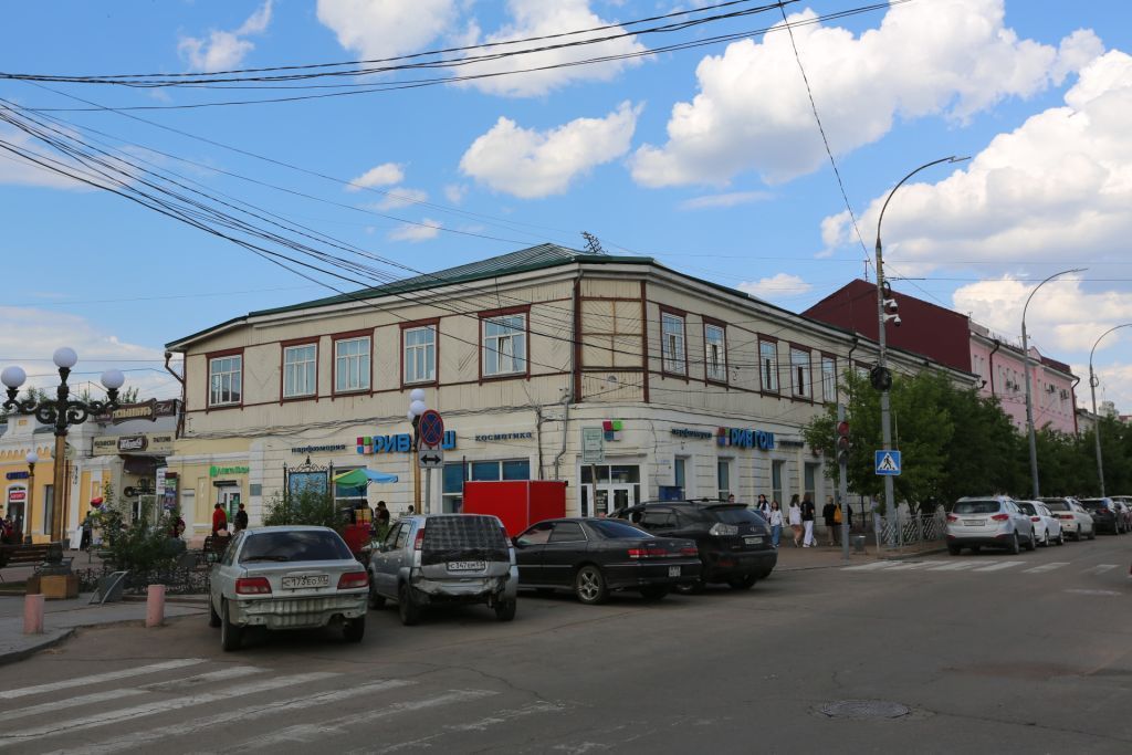 1. Местоположение. На северо-восточной стороне пересечения улиц Ленина и Кирова, формирует исторические красные линии застройки.2. Объемно-планировочное решение: 2.1. Этажность: двухэтажный. 2.2. Планировочное решение: Г-образное в плане со скошенным углом, где утроен главный вход, обращенный на перекресток ул. Ленина и ул. Кирова.3. Конфигурация кровли и материал. Вальмовая с ендовой. Материал: металл.4. Строительные конструкции и материал. Наружные и несущие внутренние стены. Материал: 1 этаж — кирпич, 2 этаж — дерево.5. Декоративные элементы фасадов:5.1. Карниз его местоположение, конфигурация, декор и материал. По периметру. Дощатый подшивной большого выноса, двуступенчатый.5.2. Рустовка 1 этажа её местоположение. Уличные фасады5.3. Лопатки 1 этажа их местоположение, конфигурация, декор и материал. Уличные фасады. Рустованные. Лопатки раскреповывают профилированный пояс. Ниже пояса узкие ниши с закругленными углами. Кол-во 6.5.4. Профилированный пояс 1 этажа, его местоположение, конфигурация, декор и материал. Уличные фасады. В нижней части оконных проемов 1 этажа широкий массивный профилированный пояс.5.5. Ризалиты 1 этажа их местоположение, количество. Южный фасад. Кол-во 3.5.6. Оконные проемы 1 этажа, их местоположение. Уличные фасады.5.7. Дверной проем 1 этажа, его местоположение. Скошенный угол5.8. Обшивка 2 этажа её местоположение, конфигурация и материал. Уличные Обшивка из узкой доски, уложенной двумя способами: 1 - над и под оконными проемами вертикально, 2 - междуоконными проемами -елочкой. Стыки обшивки акцентированы гладкой неширокой доской, выделенной цветом.5.9. Оконные проемы 2 этажа, их местоположение, конфигурация. Уличные фасады. Прямоугольные широкие, близкие к квадрату. Кол-во 17.5.10. Наличники оконных проемов 2 этажа, их местоположение, конфигурация, декор и материал. Уличные фасады. Простые гладкие, лобань трапециевидная, свесы фигурные. Кол-во 17.6. Фрагмент ограды и столбы ограды, их местоположение, конфигурация, декор и материал. Севернее здания по линии западного фасада. Ограда и столбы по верху декорированы профилированным карнизом, в уровне профилированного пояса здания - профилированный пояс. Столбы декорированы прямоугольными нишами, по полю которых три элемента - круглый и два ромбовидных. Ниже профилированного пояса узкие ниши с закругленными углами. Материал: кирпич, оштукатуренный.