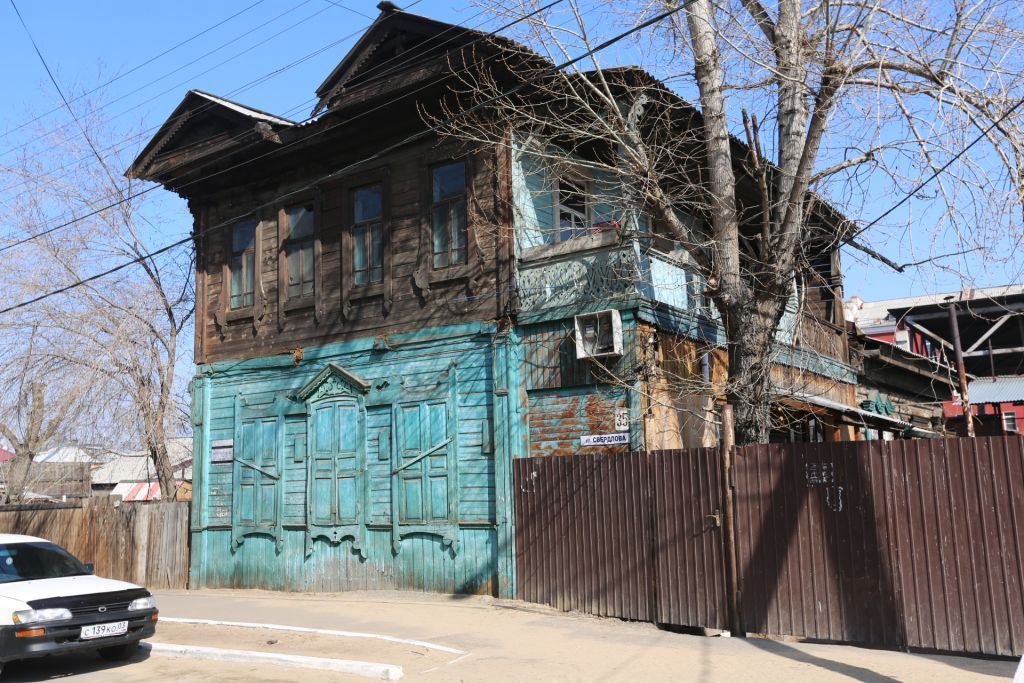 1. Градостроительное местоположение.Двухэтажный жилой дом расположен в историческом центре г.Улан-Удэ на северной стороне ул.Свердлова между пересечениями с ул.Калинина и ул.Коммунистическая. Здание относится к застройке нач. XX в.2. Объёмно-планировочное решение здания.Деревянный жилой дом имеет оригинальное объёмное решение. Вытянутый в глубину усадьбы прямоугольный в плане первый этаж перекрыт больше чем наполовину вторым этажом. Южный главный фасад имеет три окна на первом и четыре на втором этаже. К восточному фасаду жилого дома примыкает по всей длине второго этажа галерея, вписывающаяся в контуры плана первого этажа. В южном торце галереи первого этажа устроен парадный вход. Северный фасад первого этажа имеет хозяйственный вход и два окна, второй этаж северного фасада глухой.Основной объём памятника двухэтажный, прямоугольный в плане с фронтонами на карнизе большого выноса с глубоко посаженным тимпаном. С северной стороны основного объёма пристроено одноэтажное здание, с восточной стороны - веранда и открытая галерея под односкатной крышей, с западной стороны - по второму этажу объём на столбах. Главный южный фасад расположен по красной линии ул. Свердлова.Планы жилого дома имеют сложную структуру. План первого этажа имел три внутренние поперечные несущие стены. Первая стена от главного фасада делила сруб в контурах плана второго этажа на две части. Средняя поперечная стена делила план первого этажа приблизительно на равные части. Утрачена лестница на второй этаж, которая размещалась в центре здания и со стороны западного фасада освещалась узким окном.Размеры здания в плане на уровне 1 этажа 9,1x18,3 м.3. Конфигурация кровли.Кровля сложной конфигурации с вальмами.Шифер.4. Строительные конструкции и материал.Наружные стены - бревенчатые, обшиты досками с южной оба этажа, западной, северной сторон по второму этажу.Несущие внутренние стены - бревенчатые оштукатуренные. Диаметр бревен 26см.Стыки бревен с незначительным выпуском, с уличного фасада обшиты доской и декорированы филенчатыми пилястрами.Фундамент - бутовый ленточный.5.1. Карниз двухэтажного объёма здания его местоположение, конфигурация, пропорции, размеры, декор и материал.По периметру второго этажа и фронтонам.Ступенчатый карниз с подзорами с большим выносом. Подзоры в 4 ряда с пропильной резьбой 2 видов. 5.2. Карниз фризом одноэтажного объёма здания его местоположение, конфигурация, пропорции, размеры, декор и материал.По периметру одноэтажного прируба.Дощатый фриз и карниз небольшого выноса декорированы подзорами с пропильной резьбой.5.3. Фронтоны кровли их местоположение, конфигурация, пропорции, размеры, декор и материал.Южный и восточный фасады.Дощатый фриз и карниз небольшого выноса декорированы подзорами с пропильной резьбой.5.4. Оконная композиция первого этажа, южного фасада её местоположение, конфигурация, расстекловка окон, пропорции, декор наличников и ставен и их размеры.Южный фасад 1 этаж.Композиция состоит из 3 окон объединённых общей лобанью наличников, декорированной в стиле модерн. Боковые окна композиции прямые, фартук со свесами повторяющими узор резьбы лобани и имеют сдвоенные филенчатые ставни, центральное полуарочное, сандрик окна отделан профилем с ажурной резьбой, а в центре накладная резьба с растительным мотивом, ставни двуст