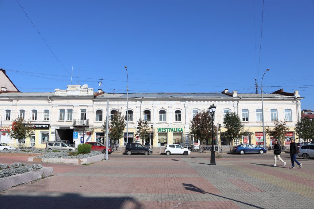 1. Местоположение: на северной стороне Площади Революции: на северной стороне ул. Кирова, между ул. Ленина и Коммунистическая. Фиксирует красную линию застройки улицы и площади.2. Объемно- планировочное решение: 2.1 Этажность: двухэтажное. 2.2 Планировочное решение: сложная планировочная структура: здание состоит из восточного, центрального и западного (с проездом) объемов. - восточный объем: прямоугольный в плане. - центральный объем: прямоугольный в плане, с двумя пристроями (западный и восточный) с севера. Западный пристрой - в плане близкий к квадрату, восточный пристрой - прямоугольный в плане. - западный объем: сложный в плане: в основе две части - восточная (с проездом) и западная. Восточная часть (с проездом) прямоугольная в плане, вытянута в глубь квартала, выступает ризалитом над южным фасадом объема. Западная часть состоит из двух разновеликих прямоугольников - южного (по линии главного южного фасада), за ним северный, меньший, со скошенным северо-восточным углом. К западному объему с севера два пристроя: восточный пристрой - близкий к квадрату, западный пристрой - вытянутый север-юг, сложный в плане. 3. Конфигурация кровли: двускатная. Пристрои центрального объема: западный - двускатная с вальмой, восточный - односкатная.4. Строительные конструкции и материал: наружные стены, несущие внутренние стены. Материал: кирпич, оштукатуренный. 5. Декоративные элементы фасадов:Восточный объем. 5.1 Карниз его местоположение, конфигурация и материал: южный фасад. Поддерживающая часть - южный, восточный фасады. Профилированный, большого выноса. Венчающая и свешивающаяся части дощатые, окрашенные, поддерживающая - кирпичная, оштукатуренная, окрашенная. Карниз раскрепован лопаткой. 5.2 Фриз его материал местоположение, конфигурация: южный, восточный фасады. Фризовая часть отделена от плоскости стены ступенчатым поясом. Фриз раскрепован лопаткой. Материал: кирпич, оштукатуренный. 5.3 Междуэтажный пояс его местоположение, конфигурация и материал: Южный фасад. Между 1 и 2 этажами. Профилированный. Материал: кирпич, оштукатуренный. 5.4 Гладкий пояс его местоположение, конфигурация и материал: Южный фасад. Над междуэтажным поясом. Широкий, гладкий. Материал: кирпич, оштукатуренный. 5.5 Пояс его материал местоположение, конфигурация: Южный фасад. Под оконными проемами 2 этажа. Квадратный в сечении. Материал: кирпич, оштукатуренный. 5.6 Лопатки их местоположение, конфигурация, и материал: Южный фасад восточный угол. В уровне второго этажа - гладкая, в уровне первого - рустована лентами до междуэтажного пояса. Лопатка раскреповывает карниз, фризовый пояс, междуэтажный пояс. Материал: кирпич, оштукатуренные. 5.7 Оконные проемы 2 этажа их местоположение, конфигурация, количество и конфигурация оконных заполнений: Южный и восточный фасады. 2 этаж. С лучковым завершением. Заполнения с лучковым завершением. Кол-во 8 (южный - 4,восточный - 4). 5.8 Проемы 1 этажа их местоположение и количество: Южный фасад. 1 этажКол-во 4. 5.9 Обрамления оконных проемов 2 этажа их местоположение, конфигурация, материал и количество: Южный фасад. Оконные проемы, 2 этаж: Трехстороннее, в виде квадратного в сечении пояска с небольшим отступлением от проема, поясок повторяя конфигурацию проема с большим отступлением от проема в верхней части. В уровне середины оконных проемов, под завершением расширени