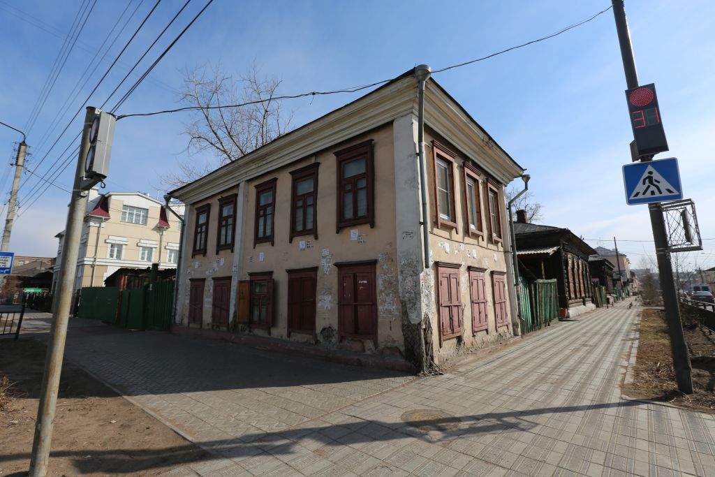 1. Местоположение: На северо-восточном углу улиц Смолина и Кирова. Западным и южным фасадами формирует красные линии застройки улиц.2. Двухэтажный деревянный дом под вальмовой кровлей. Оконные проемы прямоугольные – по первому этажу невысокие. Наличники простые деревянные. По первому этажу ставни.