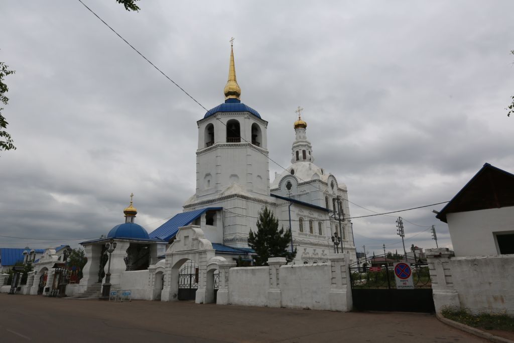 1. Местоположение: расположен в исторической части города, недалеко от правого берега реки Уда в среде исторической застройки конца XIX -начала XX веков. Размещен с отступлением от красной линии на оси улиц Ленина и Линховоина.2. Объемно-планировочное решение: имеет выраженную продольно-осевую композицию и четкое функциональное деление по культовым особенностям. Над двухэтажным квадратным в плане притвором восьмигранная колокольня (восьмерик на четверике), с севера и юга пристрои. Далее трапезная, двухэтажная, прямоугольная близкая к квадрату в плане и двухэтажный четверик -храм. Второй этаж храма - двусветный. Апсида двухэтажная, пятигранная. Перед притвором высокое массивное крыльцо-паперть с пристроем с юга.3. Конфигурация кровли: апсида - конха с восьмигранным барабаном и луковичной главкой, четверик-храм - купол с восьмигранным барабаном и луковичной главкой. Трапезная - двускатная, колокольня -купол со шпилем, имеющим расширение в нижней части, напоминающий луковку. Крыльцо - паперть - односкатная.4. Строительные конструкции и материал: кирпичные стены и сводчатые перекрытия. Стены оштукатуренные, окрашены в белый цвет.5. Декоративные элементы фасадов:- карнизный пояс его местоположение, конфигурация,пропорции, размеры, декор и материал, карниз огибает щековую арку храма, кирпичный, оштукатуренный;- междуэтажный пояс его местоположение, конфигурация, пропорции, размеры декор и материал, расположен по периметру, соединяет разные плоскости фасадов, кирпичный, оштукатуренный;- пояс его местоположение, конфигурация, пропорции, размеры, декор и материал, расположен по периметру собора над и под междуэтажного пояса, кирпичный, оштукатуренный;- щековые арки храма их местоположение, конфигурация, пропорции, размеры и материал, расположены с каждой из сторон храма в уровне свеса кровли, полуциркульные;- лопатки их местоположение, конфигурация, пропорции, размеры, кирпичные, оштукатуренные;- оконные проемы по периметру собора с лучковым завершением кирпичные, оштукатуренные, их обрамление и конфигурация;- оконные проемы восьмигранные кирпичные, оштукатуренные, их обрамление и конфигурация;- крестообразные оконные проемы их местоположение, конфигурация, размеры, расположены в щековые арках храма;- люкарны: их декор и обрамление, местоположение, конфигурация, размеры, материалы, декор выступа и обрамлении;- декор свода храма и граней, их местоположение, конфигурация, размеры, декор и материал;- декоративные элементы храма их местоположение, конфигурация, пропорции, размеры, декор и материал;- наличники, их местоположение, конфигурация, пропорции, размеры, декор и материал;- барабан свода храма его местоположение, конфигурация, пропорции, размеры, декор и материал;- барабан алтаря его местоположение, конфигурация, пропорции, размеры, декор и материал;- ниши колокольни их местоположение, конфигурация, пропорции, размеры, декор и материал;- проемы колокольни их местоположение, конфигурация, пропорции, размеры, декор и материал;- крыльцо-паперть его местоположение, конфигурация, пропорции, размеры, декор и материал.