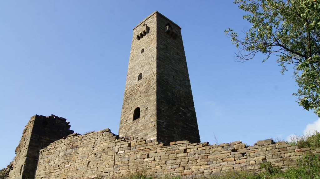 Башня жилая № 1 расположена в 4-х км к юго-востоку от райцентра Итум-Кале, среди руин замкового комплекса, сохранились остатки башни жилой, примыкающей к боевой башне. Она закрывала юго-западную сторону боевой башни.От башни сохранилась юго-восточная стена, длиной 8,4 м и высотой - 3,3 м. На ней на расстоянии 4,9 м от боевой башни, на высоте 1,4 м от основания, устроен широкий проём (1,6 х 1,2 м) с полукруглой аркой. Арка выполнена из двух каменных плит. На арке с правой стороны и на каменном блоке слева в нижней части проёма имеются петроглифы.С внутренней стороны в стене прослеживаются нищи.В кладке стен использованы хорошо обработанные камни, с применением глинисто-известкового раствора. Стены были выложены по краям обрыва, повторяя контуры рельефа.Юго-западная (7,4 м), северо-западная (10,5 м) и северо-восточная (4,37 м) стеныТакже предметом охраны являются:- градостроительная характеристика здания, участвующего в формировании застройки исторического комплекса;- объемно-пространственная композиция: четырехугольные в плане башни;- материал капитальных стен и техника кладки: сложены из разноразмерных обработанных камней на известковом растворе; - место расположения комплекса в его историческом ландшафтном окружении; - петроглифы; - габариты, конфигурация дверных и оконных проёмов; - материал капитальных стен: сланцевый камень с использованием известняка и камня-песчаника; - интерьер башен: замковые-угловые камни; - культурный слой, в пределах границ территории объекта