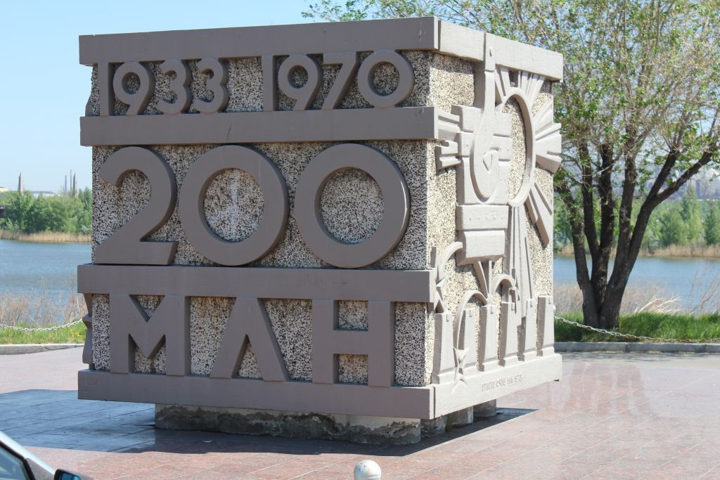 Памятный знак, установленный в честь выпуска 200 миллионов тонн стали Магнитогорским металлургическим комбинатом