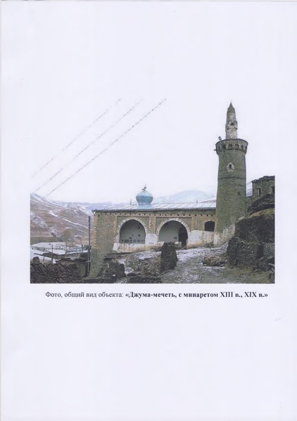 1. Месторасположение и градостроительные характеристики:- здание в старой части исторической застройки села на выровненной площадке на крутом рельефе, имеющем падение на восток, на склоне горы с высоким цокольным этажом с одной стороны;- круглый в плане минарет мечети высотой 18 м, играющий большую роль в ансамбле всего села.2. Объемно-пространственная композиция основного объема здания:- одноэтажное прямоугольное в плане сооружение мечети, с размерами мечети 12,3x19,6 м и толщиной стен около 60 см., с восточной стороны опирающееся на высокую подпорную стену, с западной - заглубленное в землю. С выделяющимися среди окружающей застройки размерами и приемами архитектурного решения: большими формами дверных и оконных проемов обрамленных деревянными коробками с резьбой; - минарет мечети, круглый в плане, являющийся архитектурной доминантой застройки села. Размеры минарета - общая высота более 18 м, высота до низа консолей аркатурного пояса 11,55 м, диаметр - внизу 3,8 м, а под аркатурным поясом 3,2 м, высота аркатурного пояса 1,3 м, высота венчающего купола 5,7 м.3. Композиция и архитектурно-художественное оформление фасадов:- два главных фасада мечети - северный и восточный. Восточный фасад, опирающийся на высокую подпорную стену с двумя рядами проемов, двухпроемные окна арочной формы с дверными проемами арочной формы; - главный вход в мечеть с северного фасада с широкой аркой галереи; - резные камни XIII в. с арабскими надписями куфическим шрифтом с элементами геометрического рисунка на северном фасаде; - арочные формы ниш, проемов, консольного пояса верхней площадки; - венчающий купол минарета; - вмонтированные в кладку минарета резные камни с арабскими надписями; - аркатурный пояс минарета (высотой 1,3 м.); - консоли аркатурного пояса минарета; - фигурка животного в нише минарета.4.Архитектурно-художественное оформление внутренних помещений мечети:- размеры молитвенного зала в плане 11,05 х 16,3 м, высота 4 м. Три двери, с деревянными коробками в виде монументальных арочных порталов, покрытых орнаментальной резьбой в северной и восточной стене мечети. - внутреннее помещение (молельный зал) мечети разделенное на четыре нефа тремя рядами опорных столбов; - 14 деревянных столбов, 7 из них богато декорированных (2 новых, установленных в 90-х годах XX в., без резьбы). Пять наиболее древних столбов Т-образной формы в мечети. Семь столбов XIX века (из двух отдельных частей - подбалки и ствола с базой) с призматической формы подбалкой с тонкой геометрической резьбой; - плоское перекрытие мечети на деревянных опорных столбах.