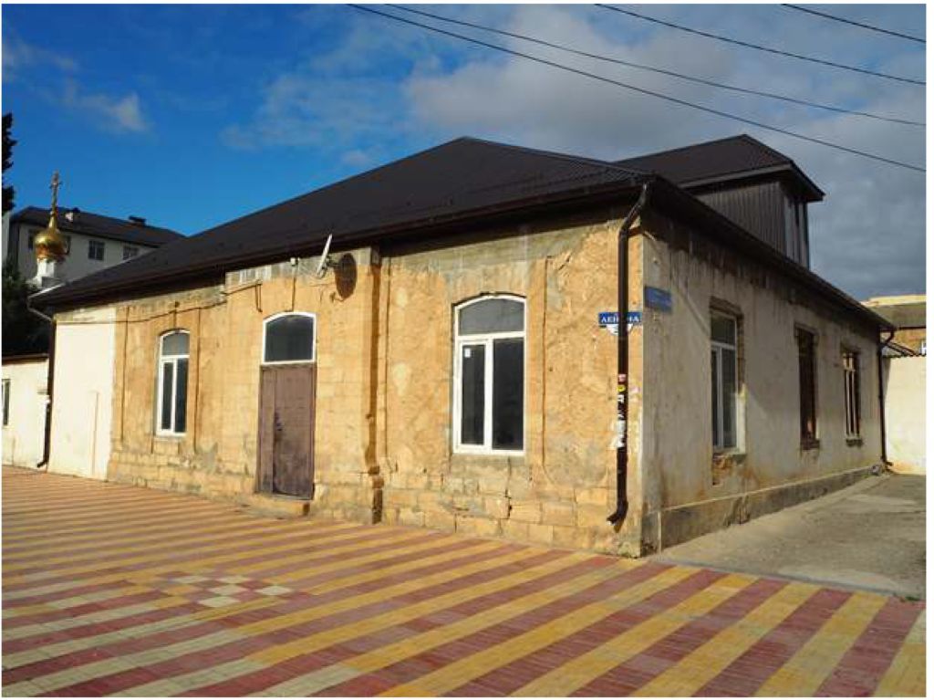 Местоположение:здание расположено на пересечении ул. Ленина (по северо- западной стороне) и ул. Азиза Гильядова (по юго-западной стороне). Лицевым юго- восточным фасадом формирует красную линию застройки ул. Ленина, лицевым северо-восточным фасадом формирует красную линию застройки ул. Азиза Гильядова.Объемно-пространственная композиция:-прямоугольная в плане форма исторического объема здания;Композиция фасадов:- юго-восточного (лицевого) - симметричная в 3 световые оси, включая ось дверного проема;Архитектурно-художественное оформление юго-восточного фасада:- выступающий цоколь простого профиля; - местоположение и габариты центрального ризалита с угловыми фасками и профилированной раскреповкой в нижней части; - местоположение и габариты прямоугольных контррельефных филенок поля стен боковых фрагментов фасада с закруглением по нижнему абрису; - местоположение и горизонтальные габариты оконных проемов с лучковыми перемычками; - местоположение и форма дверного проема с лучковой перемычкой; - гладкие рельефные наличники оконных проемов с клинчатыми перемычками и имитацией замковых камней; - клинчатая перемычка дверного проема с имитацией замкового камня.Конструкция капитальных стен юго-восточного фасада:- открытая кладка из крупных блоков местного природного камня.