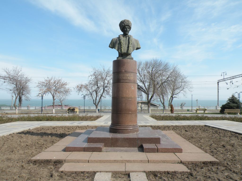 1. Месторасположение и градостроительные характеристики:- памятник расположен в приморской части города Махачкалы, у здания Аварского театра, в сквере Сулеймана Стальского.2. Объемно-пространственная композиция:- форма памятника и композиция;- полированный круглый постамент из красного гранита высотой 3,1 м.;- видовые связи.3. Архитектурно-художественное решение:- бронзовый бюст на постаменте цилиндрической формы из красного гранита;- зелёная зона шириной 4,6 м. по периметру и металлическая ограда.