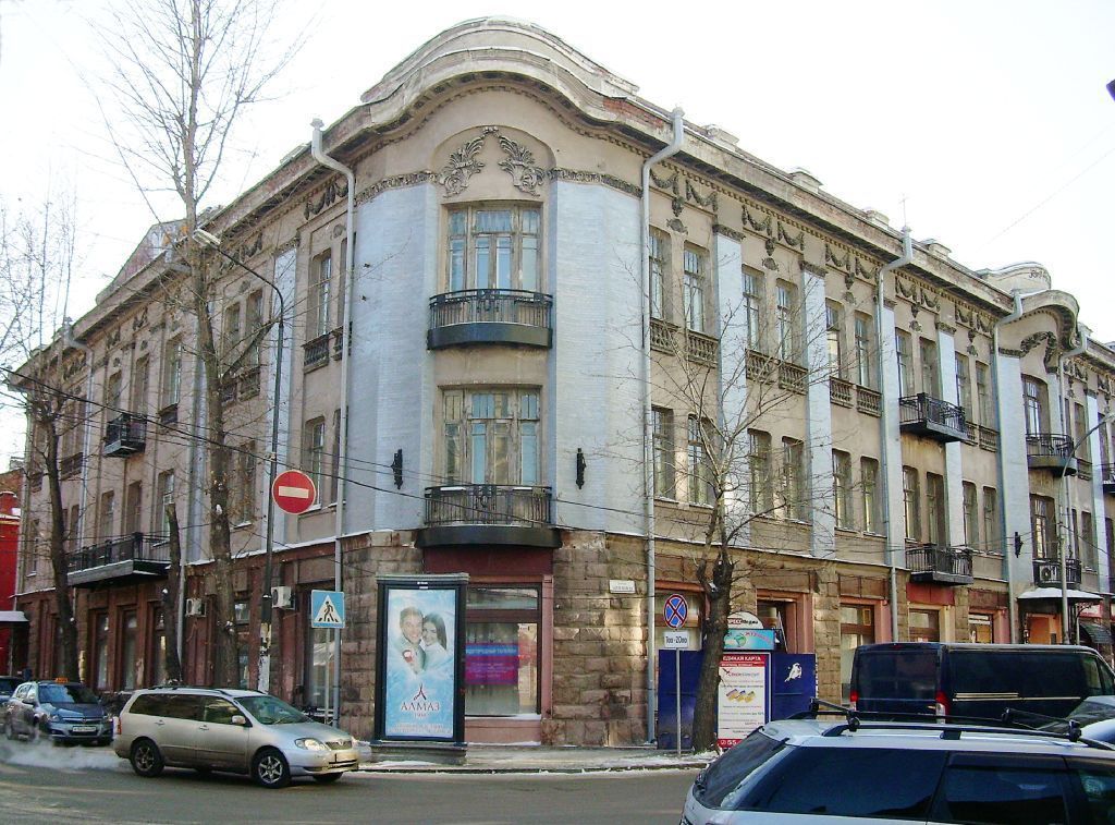 Градостроительное положение здания: угловое расположение здания на пересечении улиц Карла Маркса (бывш. ул. Большая) и Богдана Хмельницкого (5-ая Солдатская). Въездные ворота со стороны ул. Богдана Хмельницкого (поставленные с незначительным отступом от красной линии). Габариты здания в плане и по высоте. Объёмно-планировочное построение в габаритах капитальных конструкций - кирпичное трёхэтажное здание с подвалом, состоящее из двух вытянутых вдоль улиц равновысоких корпусов. План здания - Г-образный, со срезанным наружным углом (под углом 50°); крыло здания вдоль ул. Карла Маркса более протяжённое, чем крыло по ул. Богдана Хмельницкого. Планировочная схема здания - наружные капитальные стены с внутренними несущими стенами: одной продольной (проходящей посередине всего здания) и поперечными. Местоположение, габариты, конфигурация и оформление дверных и оконных проемов здания. Композиционное решение и декоративное оформление здания в стиле модерн:- лицевой фасад по ул. Карла Маркса: композиция фасада в 10 осей, с выраженными вертикальными и горизонтальными членениями. Вертикальные членения - лопатки - разбивают стену фасада по горизонтали на прясла (всего девять), более широкие лопатки выделяют центральную часть с входом по 6-ой оси и акцентируют углы (лопатка левого угла одновременно является частью огибающей лопатки срезанного угла здания, лопатка правого угла дополнена слева половиной лопатки). К горизонтальным членениям фасада относятся: цоколь, междуэтажное членение, подоконные пояса, фриз, карниз и парапетное ограждение;- лицевой фасад вдоль ул. Богдана Хмельницкого: несимметричная композиция фасада в 7 осей, состоящая из разделённой четырьмя лопатками центральной части, с примыкающими к ней: справа - двумя пряслами, фланкированными двумя лопатками (крайняя правая лопатка одновременно является частью огибающей лопатки срезанного угла здания), а слева - одним пряслом и боковой частью с входом. Все три прясла (одно слева и два справа от центральной части) подчёркнуты заглублёнными нишами (в полкирпича) на высоту от цоколя до фриза;- скругленный срезанный угол, выходящий на пересечение ул. Карла Маркса и Богдана Хмельницкого: предметы охраны срезанного угла аналогичны предметам охраны центральной части лицевого фасада по ул. Карла Маркса, за исключением лопаток, оконного проёма первого этажа и межэтажного членения;- консольные балконы с металлическими коваными ограждениями - решётки из вертикальных элементов с орнаментом и декором в стиле модерн (ограждение балкона на двором фасаде простое кованое металлическое): прямоугольные балконы расположенные в пряслах по 4-ой и 8-ой осям фасада по ул. Карла Маркса (по два балкона в прясле один над другим); прямоугольный балкон и протяженный прямоугольный балкон, расположенные по средней оси центральной части фасада по ул. Богдана Хмельницкого; по два полукруглых консольных балкона (один над другим) в центральной части фасада по ул. Карла Маркса и на скругленном срезанном углу выходящий на пересечение ул. Карла Маркса и Богдана Хмельницкого; балкон на дворовом фасаде с простым металлическим кованым ограждением;- металлические козырьки: полукруглой формы с орнаментом и декором в стиле модерн над главным входом в центральной части фасада по ул. Карла Маркса (почти плоская веерная 