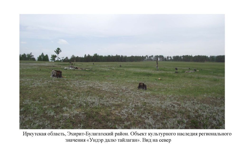 Предметом охраны объекта культурного наследия регионального значения «Ундэр Далю тайлаган» (достопримечательное место, место совершения религиозных обрядов), расположенного в Эхирит-Булагатском районе Иркутской области, на склоне горы, в 1,2 км к востоку от деревни Кукунут, площадью 11 370 кв. м, является:- часть земной поверхности в границах территории объекта с существующими формами рельефа и расположенными на территории искусственными сооружениями в виде каменных выкладок-обо, жертвенников шэрээ, очагов, кострищ, сэргэ и прочего, которые несут в себе информацию об истории, культуре и быте коренного населения, исповедующего традиционный шаманизм западных бурят в период этнографической современности (XIX-XXI вв. н.э.).