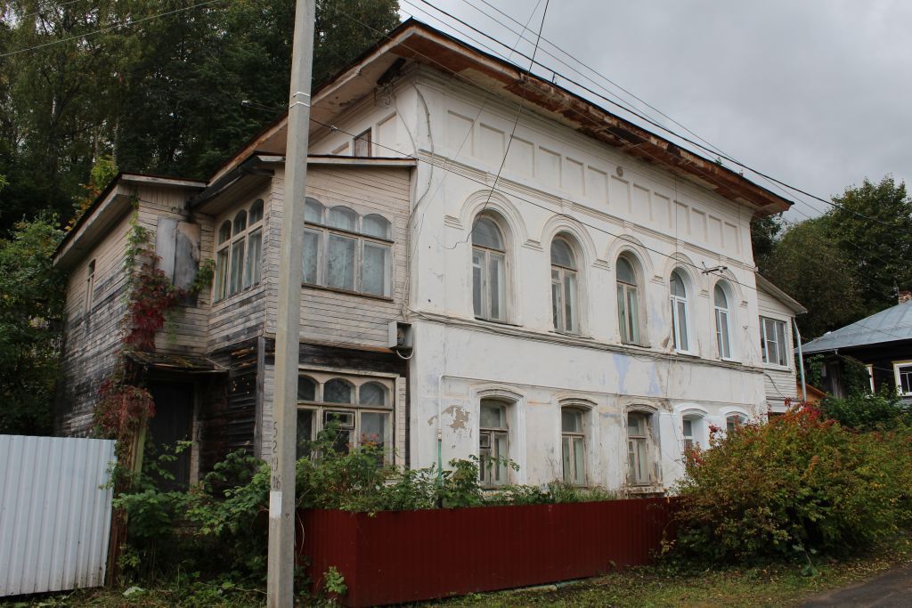 ОБЪЕМНО-ПРОСТРАНСТВЕННАЯ СТРУКТУРА ОБЪЕКТА: Жилой дом расположен по красной линии ул. Юрьевская (бывшая ул. Горького). Крупное здание в стиле позднего классицизма, имеет симметричную композицию. Дом двухэтажный с антресолями, квадратный в плане. - КОНСТРУКТИВНЫЕ ОСОБЕННОСТИ: Стены кирпичные, межэтажные перекрытия деревянные, стропильные конструкции деревянные, крыша вальмовая.- ВНЕШНЕЕ ДЕКОРАТИВНОЕ УБРАНСТВО: Главный фасад, в пять оконных осей. Стены оштукатурены, побелены. Окна первого этажа лучковые с тянутыми наличниками и подоконными полочками. Окна второго этажа высокие, арочные, с тянутыми наличниками, архивольтами и замковыми камнями. Окна антресольного этажа лучковые, небольшие по размеру.Под окнами второго этажа проходит тянутый межэтажный пояс. В уровне верха окон первого этажа - тянутый пояс, повторяющий очертание лучковых перемычек. Широкий фриз с ширинчатым поясом в уровне антресольного этажа частично заходит на восточный и западный фасады. Фриз подчеркнут профилированным тянутым поясом. Стены завершаются многопрофильным карнизом. Углы здания акцентированы пилястрами. Карниз крыши большого выноса. Крыша покрыта фальцованным железом.- ВНУТРЕННЕЕ ДЕКОРАТИВНОЕ УБРАНСТВО: отсутствует.