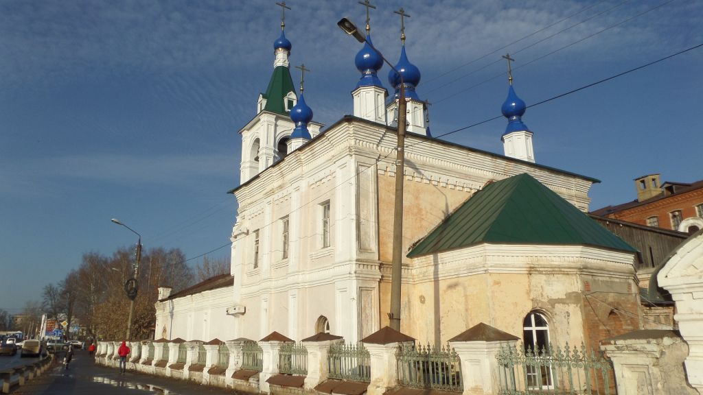 «Подворье Николо-Шартомского монастыря», 1880 г.1. Градостроительное положение: площадь в Заречной части города, около моста через Тезу.2. Объемно-пространственная композиция: к северу от храма расположен двухэтажный братский корпус, к югу – ограда, в которую включена прямоугольная, обращенная торцом к улице палатка.3. Конструкции и материалы: стены из кирпича на известковом растворе, оштукатурены и окрашены; металлическое покрытие столбов ограды, палатки, глав, шатра и кровель стропильной конструкции.