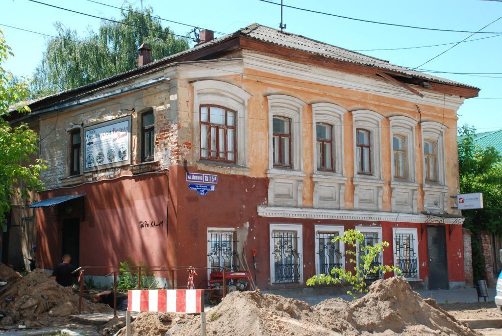 1. Объемная композиция: двухэтажный, прямоугольный в плане объем с вальмовой крышей с двухэтажной пристройкой с восточного фасада (не включая пристройку из силикатного кирпича, обращенную в сторону дома № 15а).2. Конструкции и материалы: капитальные стены из кирпича, их местоположение, кровля – фальцевый металлический лист.3. Архитектурная композиция фасадов:– структура расположения и форма оконных проемов фасадов, месторасположения карнизов, лопаток, наличников;– на главном фасаде – композиционная структура окон как 5+1;– на главном фасаде – межэтажный карниз, широкий антаблемент.4. Стилистика и элементы декоративного оформления фасадов:– основной объем – стиль эклектика, оштукатуренный главный фасад;– широкий венчающий антаблемент с широким плоским архитравом, многоступенчатой тенией, плоским фризом и плоским карнизом большого выноса;– междуэтажный карниз из нескольких тяг и ряда зубчиков;– прямоугольные окна первого этажа – с профилированными наличниками, профилированные наличники верхних лучковых окон дополнены лучковыми бровками;– ступенчатые выступы под окнами второго этажа – с опиранием на стойки с завершениями в виде широкого каблучка, между ними – глубокие перспективные нишки.– первоначальная расстекловка окон.