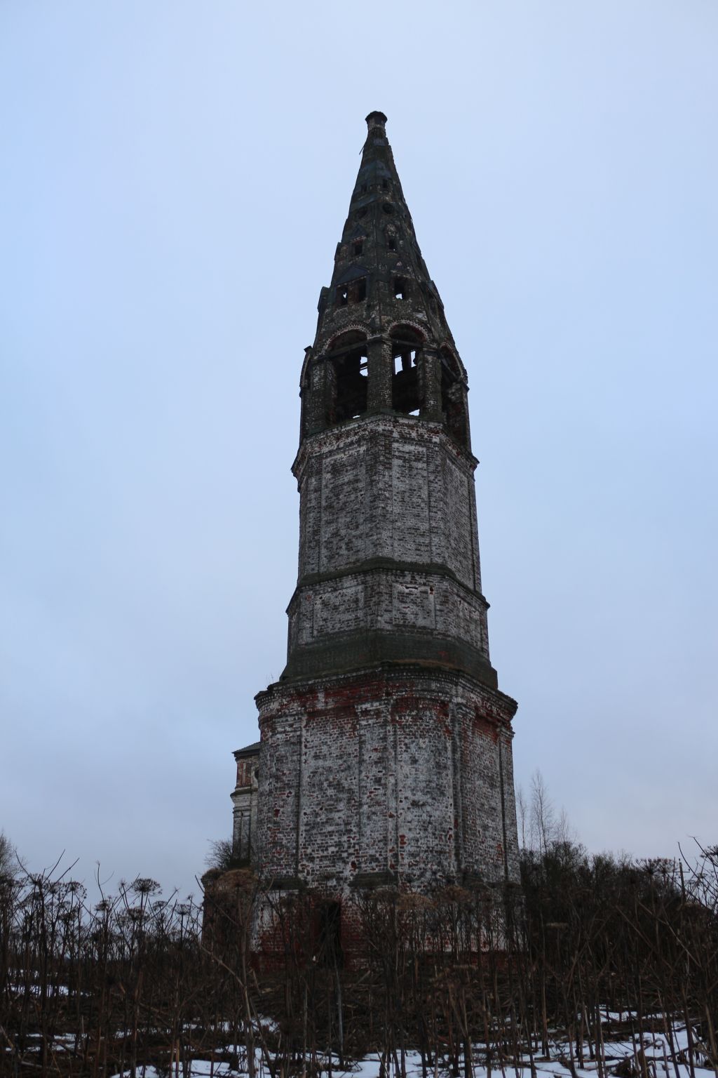 1. Объемно-пространственная композиция: восьмерик с двойным постаментом на четверике со скругленными углами. Ярус звона завершается шатром с главкой.2. Элементы фасадной композиции: пилястры, оформляющие четверик, огибающие лопатки и карниз, оформляющие столп. Филенки на постаменте. Форма арок звона, форма слухов на шатре.3. Элементы оформления фасадов: форма пилястр четверика, профилировка карниза, оформление арок звона и слухов на шатре.