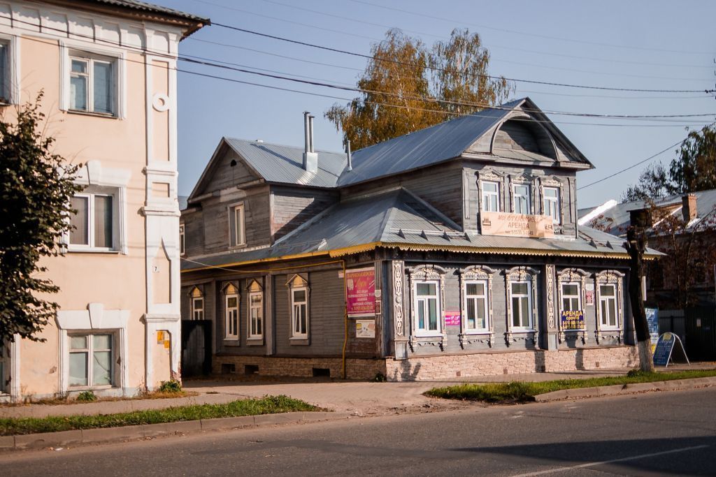 1. Градостроительное положение: в центре города Шуи, на красной линии ул. Свердлова.2. Объемно-пространственная композиция: одноэтажный с крестчатым мезонином жилой дом на полуподвале.3. Конструкции и материалы: полуподвал кирпичный, оштукатуренный, стены рублены из бревен с остатком и обшиты тесом, кровли металлические. 4. Элементы фасадной композиции: крупная арочная ниша на треугольном фронтоне мезонина со стороны главного фасада. Завершения мезонина на боковых фасадах треугольными полуфронтонами с полукруглыми чердачными окнами. Членение основного этажа пилястрами, которые фиксируют углы здания и перерубы. Прямоугольная форма окон основного этажа и мезонина.5. Элементы оформления фасадов: разное оформление главного и боковых фасадов.На боковых фасадах наличники с прямоугольными завершениями, на которые наложены треугольные сандрики. «Полусолнца» в тимпанах сандриков и фигурные ребристые вставки на подоконных досках в технике глухой резьбы. «Ушки» на боковинах. Рамочные наличники мезонина. На главном и прилегающих частях боковых фасадов широкий фриз с накладным орнаментом и фигурными кронштейнами. Карниз с резным подзором. Наличники основного этажа с трехчастными лучковыми, а мезонина – щипцовыми завершениями сандриков. Накладной орнаментальный декор в тимпанах, на боковинах наличников и пилястрах. «Ушки» в верхней части боковин. Филенчатые лопатки, оформляющие углы мезонина.Рисунок оконных переплетов.