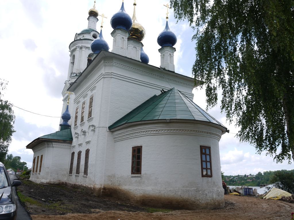 - ОБЪЕМНО-ПРОСТРАНСТВЕННАЯ СТРУКТУРА ОБЪЕКТА: композиция строго симметрична относительно главной оси запад-восток; церковь трехчастная, включает летний бесстолпный храм с полукруглым в плане алтарем, широкую бесстолпную трапезную и ярусную колокольню. К двухсветному объему четверика летнего храма, увенчанному пятью луковичными главами с «перехватом» на высоких граненых барабанах, примыкает с востока одноапсидный алтарь, с запада – трапезная. К широкому пониженному объему трапезной примыкает трехъярусный столп колокольни, увенчанный изящной луковичной главой на стройном граненом барабане. Здание кирпичное, побеленное; материал (размер кирпича 27/13/7,5-8,0);- ВНЕШНЕЕ ДЕКОРАТИВНОЕ УБРАНСТВО: храм: антаблемент четверика холодного храма; скругленность углов трапезной и алтаря; сухарики карнизов; обрамление окон; сандрики на упрощенных консолях; колокольня: плоские спаренные пилястры; трехчетвертные колонны второго яруса; цилиндрический объем третьего яруса, декорированный спаренными трехчетвертными колоннами; сухарики карнизов неполных антаблементов;- ВНУТРЕННЕЕ ДЕКОРАТИВНОЕ УБРАНСТВО: сомкнутый свод основного объема; круглые ниши восточной стены трапезной, служившие алтарями приделов храма; клеевая живопись стен и сводов четверика; гризайльный орнамент стиля барокко; росписи выполнены в классической манере; композиции сводов («Воскресение» (вост.), «Несение креста» (южн.), «Положение во гроб» (сев.), «Пригвождение к кресту» (зап.)) обрамлены орнаментом, включающим картуши, завитки, барочную сетку; над окнами верхнего света в технике гризайли изображены церковные атрибуты, на выступающих простенках всех ярусов – святые; наиболее выразительна живопись западной стены.
