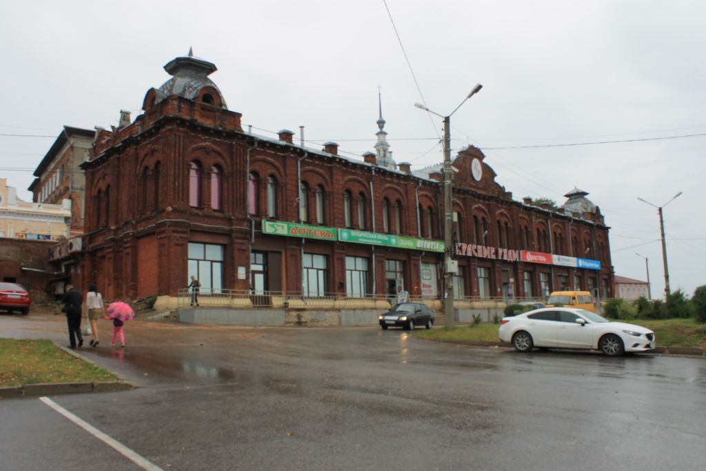 «Красный корпус», 1911 г. (Ивановская область, г. Кинешма, Рылеевская ул., 1)1. Объемная композиция: протяженный прямоугольный объем под вальмовой крышей с акцентами над центральной частью в виде аттика с продолжающимся за ним повышением аналогичного сечения и над углами со стороны площади Революции в виде восьмигранных куполов.2. Конструкции и материалы: стены и башенки на кровле из кирпича, конструктивная система здания бескаркасная с несущими наружными и внутренними стенами, перекрытия – бетонные сводики по металлическим балкам, поверхности скатной кровли – фальцевый металлический лист, окрашенный неблестящей краской, поверхности кровли башенок – металлические чешуйчатые фактуры.3. Архитектурная композиция фасадов: на двухэтажном фасаде со стороны площади Революции – 15 двухъярусных прясел, расчлененных лопатками; внутри каждого прясла – широкий межэтажный пояс; в каждом прясле на первом этаже – большое витринное окно (некоторые с дверьми), на втором – по два окна арочного завершения с архивольтами, помещенных в арочную нишу; венчающий карниз; аттик над центральной частью сложной формы, над лопатками на кровле – тумбы, ад угловыми пряслами – прямоугольные аттики с центральными арочными акцентами, выше – купола; на двухэтажных торцевых фасадах – по три прясла, разделенных лопатками, центральное – узкое глухое, в двух крайних – аналогичная пряслам на главном фасаде композиция за исключением окон на первом этаже; одноэтажный фасад по улице Рылеевской, разделенный лопатками на прясла, в каждом из них – квадратное крупное окно, над центральной частью – трехчастный аттик, фасад завершен парапетным поясом с рядом стилизованных закомар, над центральными пряслами левой и правой частей фасада и над угловыми пряслами – аттики в виде разорванных фронтончиков, фланкированные тумбами с пинаклями; историческая форма расстекловки окон.