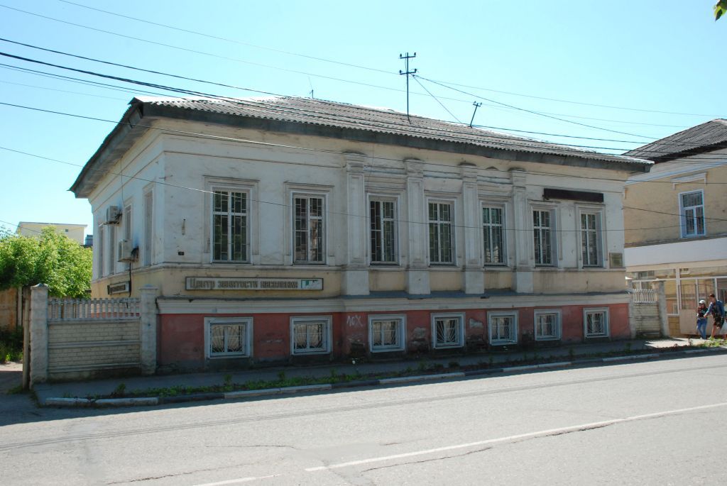 1. Объемная композиция объекта: Г-образный в плане объем, вытянутый вдоль красной линии улицы и завершенный вальмовой крышей.2. Типологическая и объемно-планировочная структура объекта: ячейковая объемно-планировочная структура.3. Конструктивное решение: стены – кирпичные. Конструктивная система – бескаркасная. Крыша по деревянным стропилам, кровля – металлическая.4. Архитектурная композиция фасадов: центр главного фасада по ул. Комсомольской – с 7 осями проемов, с 3-оконным ризалитом на 1-м этаже, над которым на 2-м этаже сформирован 4-хпилястровый портик. На боковых фасадах – четкий метр окон. Между 1-м и 2-м этажами – широкий горизонтальный профилированный пояс. Под окнами второго этажа – узкая тяга.5. Декоративное убранство фасадов: здание в стиле классицизм. Оштукатурен главный, восточный и часть заднего фасада до пристройки. Прямоугольные окна на главном и восточном фасадах – обрамлены профилированными наличниками, дополненными сандриками с гирляндами в интерколумниях пилястр. В завершении фасадов – широкий антаблемент с плоским архитравом, многоступенчатой тенией, многоступенчатым фризом. Пилястры портика на главном фасаде – псевдодорического ордера, с высокими базами, на лицевой части пилястр – многоступенчатые неглубокие ниши практически на всю плоскость пилястр.