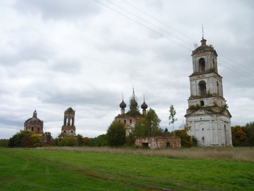 1. Градостроительное положение: расположение в центре д. Алексино.2. Пространственно-планировочная структура достопримечательного места: постановка храмов в восточной части обширной сельской площади по линии запад-восток, друг за другом со смещением с середины территории к югу (западнее церковь Рождества Богородицы, восточнее – церковь Иоакима и Анны). Постановка церкви Иоакима и Анны с небольшим отклонением от продольной оси. Расположение школьного сада и здания народного училища к югу от храмового комплекса.3. Ценные элементы историко-градостроительной среды:– Церковь Рождества Богородицы;– Церковь Иоакима и Анны;– Церковная лавка (палатка);– Народное училище.3.1. Церковь Рождества Богородицы:3.1.1. Объемно-пространственная структура: квадратный в плане высокий трехсветный четверик, перекрытый четырехскатной кровлей и увенчанный пятью луковичными главами с чешуйчатым покрытием. Примыкающий с востока прямоугольный алтарь с более узкой полукруглой апсидой и прямой восточной стеной. Расположенная с запада равная по высоте алтарю и чуть более широкая по сравнению с основным объемом прямоугольная трапезная. Узкий притвор и еще более узкий переход к колокольне, примыкающий с запада к трапезной. Колокольня, состоящая из трех поставленных друг на друга четвериков, с полуярусом между нижними ярусами. Завершающая колокольню гуськовая четырехгранная кровля с барабаном 3.1.2. Конструкции и материалы: здание кирпичное, побелено по кирпичу без штукатурки. Кровля и покрытие глав металлические. Сомкнутый свод в основном объеме. В интерьере четверика окна по осям объединены идущими от пола до свода глубокими, расширяющимися внутрь храма, нишами. На узких простенках выделяются лопатки, переходящие вверху в распалубки основания сомкнутого свода.3.1.3. Элементы фасадной композиции: три оконные оси четверика. Завершение на всех фасадах нижней двусветной части антаблементом и треугольным фронтоном. Углы верхнего яруса, выделенные двойными, простенки – одиночными пилястрами. Среднее окно, вписанное в полуциркульную нишу. Глухие окна на восточном и западном фасадах. Лучковые сандрики на S-образных кронштейнах над дверными и оконными проемами нижнего света. Стены алтаря и трапезной, оформленные ленточным рустом, над окнами, переходящим в клинчатый. Тройные окна с более широкой средней частью на боковых фасадах притвора, над которыми расположены широкие рельефные полуфронтоны. Портики из тосканских полуколонн, оформляющие арки колокольни. Портики из двух пар полуколонн, поддерживающих фронтоны в нижнем ярусе. Портики из четырех полуколонн, поддерживающих широкий антаблемент в среднем ярусе. Крайние полуколонны, врезанные в углы яруса и превращенные в трехчетвертные колонны. Портики из двух полуколонн с фронтоном в верхнем ярусе. Стены полуяруса оформленные ленточным рустом. Трехчастные полуциркульные ниши в центре, с каждой стороны полуяруса, над которыми руст переходит в клинчатый. Сквозные центральные проемы в трехчастных нишах.3.2. Церковь Иоакима и Анны:3.2.1. Объемно-пространственная структура: основной четверик, на который поставлен широкий световой восьмерик, несущий граненый купол с главкой на восьмигранном барабане. Трехчастный алтарь с полукруглой апсидой, примыкающий к четверику с востока. В углах небольшие квадратн