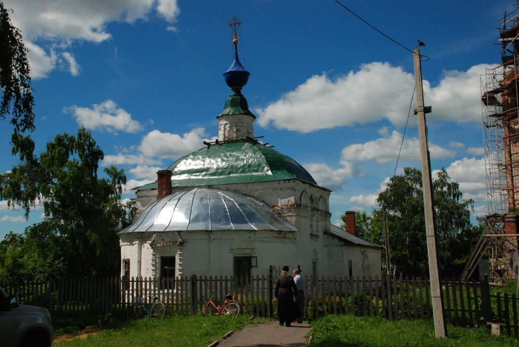 Объемно-пространственная структура объекта: особенностью объемного построения является сочетание небольшого одноглавого храма с сильно развитой в плане низкой трапезной. Четверик храма с полукруглой апсидой вытянут в направлении поперечной оси.Конструктивные особенности: материал конструкций (кирпич, дерево, фундамент бутовый); кровля трапезной двускатная, у четверика кровля гуськового профиля, у апсиды полукруглый шатер. Перекрытия четверика – сомкнутый свод, апсиды – конха, трапезной – система коробовых сводов с распалубками. Оконные проемы – прямоугольной формы. Материал – дерево. Композиция: 3 окна по окружности апсиды, 2 окна на северном фасаде и 4 окна на южном фасаде трапезной, 1 окно первого света на северном фасаде и 2 окна 1 и 2 света на южном фасаде четверика.Внешнее декоративное убранство: углы основного объема выделены широкими лопатками, а завершение – тремя арками декоративных закомар между поясами полочек и поребрика. Верхнее окно четверика – с небольшим наличником – врезано своим завершением в среднюю закомару. Нижнее имеет более скромное обрамление с килевидным кокошником (на южном фасаде срублен). Северный фасад трапезной отмечен в центре перспективным порталом первоначального входа (переделан в окно) с дыньками на боковых колонках и килевидной аркой завершения. Композиция южного фасада трапезной образована ритмом четырех крупных окон в скромных наличниках с треугольными фронтончиками. Барабан украшен аркатурой с перехватами.Внутреннее декоративное убранство: масляная живопись на евангельские темы на сводах и стенах храма и трапезной типична для конца XIX века. Главный трехъярусный иконостас в русском стиле относится к концу XIX века. Фризообразный средний ярус с вытянутыми по горизонтали иконами отделяет нижний ярус от верхнего, с арочными завершениями. Иконостас декорирован массивной резьбой в обрамлении икон, на царских вратах и витых колонках. Одноярусный иконостас южного придела в трапезной выполнен в скромных формах русского стиля в конце XIX века. Ряд икон и декоративные детали утрачены. В завершении – килевидные арки с резными подзорами. В храме сохранилась деревянная скульптура 1 половины XIX века (изображения Христа в темнице и Саваофа).