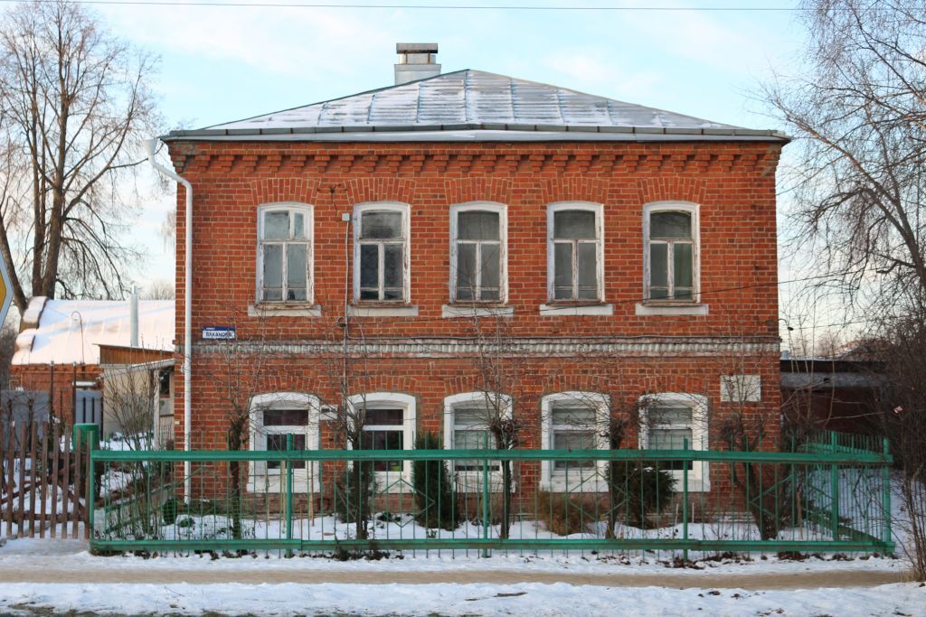 Объемно-пространственная структура объекта: градостроительное положение (здание расположено в центральной части п. Палех); план здания (прямоугольник, вытянутый с юга на север); композиция (здание из красного кирпича в 5 оконных осей); этажность (два).Конструктивные особенности: материал конструкций (кирпич, дерево); фундамент каменный, ленточный; оконные проемы (форма: прямоугольник, в верхней части слабо выраженное полуциркулярное завершение, материал: дерево, геометрия рисунка переплета, расстекловка); кровля (форма: четырехскатная, материал: железо).Внешнее декоративное убранство: межэтажный карниз - пояс поребрика между двух прямоугольных валиков, венчающий карниз городков, над окнами главного фасада – наличники, оформленные плоской вертикальной кладкой высотой в 1 кирпич на первом этаже и в 1,5 кирпича – на втором; информационная доска с текстом: «В этом доме с 1907 по 1935 г. жил и работал художник-палешанин Заслуженный деятель искусств РСФСР Баканов Иван Михайлович».