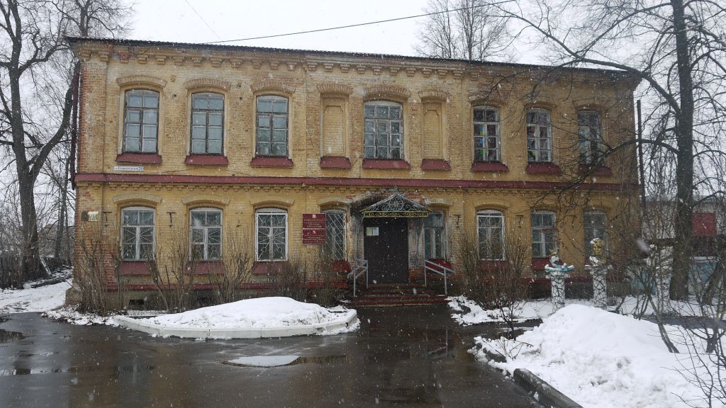 «Училище», 1889 г. (Ивановская область, г. Кохма, Советская ул., 30)1. Объемно-пространственная композиция: училище двухэтажное, прямоугольное в плане под вальмовой кровлей.2. Элементы фасадной композиции: легкий центральный ризалит, угловые лопатки, лучковая форма оконных и дверных проемов, их расположение в неглубоких нишах со срезанными боковыми краями. Выступающие из плоскости фасада лучковые перемычки. Филенчатые ложные окна, фланкирующие широкое окно лестничной клетки. Межэтажный и венчающий карнизы на ступенчатых консолях. Металлический зонт над главным входом.3. Элементы оформления фасадов: профилировка карнизов, форма филенок ложных окон, рисунок ажурного металлического зонта над входом.