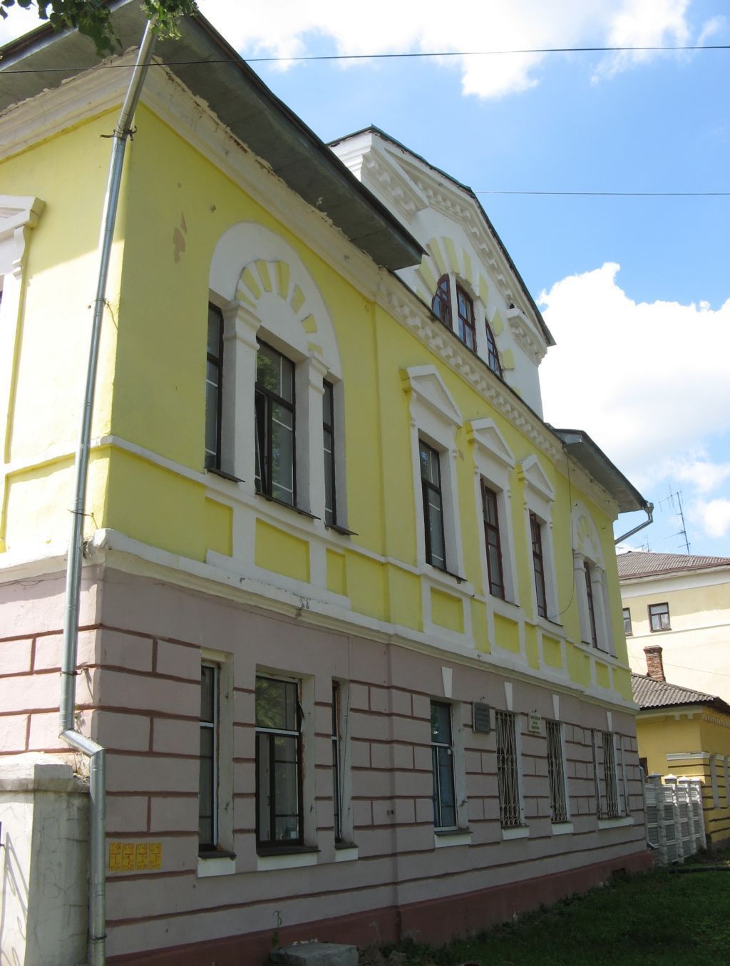 ОБЪЕМНО-ПРОСТРАНСТВЕННАЯ СТРУКТУРА ОБЪЕКТА: градостроительное положение (расположен на волжском бульваре и главным фасадом обращен к Волге); план здания (прямоугольник); этажность (двухэтажный с мезонином); композиция (кирпичное оштукатуренное и окрашенное здание);КОНСТРУКТИВНЫЕ ОСОБЕННОСТИ: материал конструкций (кирпич: размер: 7x13x27см, дерево); кровля (форма: сложная, материал покрытия: железо); оконные проемы (форма: прямоугольник, полуциркульное: композиция: в мезонине; геометрия рисунка переплета; материал: дерево; цветовое решение: коричневый);ВНЕШНЕЕ ДЕКОРАТИВНОЕ УБРАНСТВО: ризалит (форма: прямоугольник, материал: кирпич, композиция: центральная часть главного фасада, декор: руст: форма: квадровый в «перевязку» композиция: на первом этаже); межэтажный пояс (форма: простая, материал: кирпич, декор: ниши- филенки (материал: кирпич, форма: прямоугольник, композиция)); подоконная тяга (материал: кирпич, композиция: по периметру здания); мезонин (фронтон: (форма: неполный треугольник, материал: кирпич, многопрофильный карниз: декор: сухарики)); оконный проем (форма: полуциркулярное, трехчастное; декор: рустованный архивольт, композиция: в центральной части мезонина); декор оконных проемов (полукруглая арочная ниша; пилястры (форма: простая, материал: кирпич), декоративный рустованный архивольт и треугольные сандрики на кронштейнах второго этажа (материал: кирпич, композиция); замковый камень (форма: трапеция, материал: кирпич)); фриз (форма: простая, материал: кирпич, композиция); карниз (форма: сложная: композиция, декор: сухарики в ризалите); информационная надпись (форма: прямоугольник, цвет: серый, текст: «Здесь с 15 февраля по 1 марта 1907г. находился первый Кинешемский Совет рабочих депутатов»).