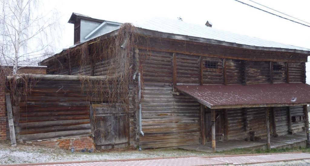 «Лабаз», вт. пол. XIX в. (Ивановская область, Юрьевецкий район, г. Юрьевец, въезд Весниных, 8) (вид – памятник).1. Объемно-пространственная композиция: почти квадратный в плане двухэтажный деревянный объем под вальмовой кровлей с выпускным чердачным окном. Высота второго этажа ниже первого. Галерея навес вдоль южного фасада. 2. Конструкции и материалы: деревянный сруб-пятистенок, выполненный из бревен «в обло» на кирпичном цоколе. Одноэтажная деревянная бревенчатая пристройка, рубленая «в обло» с западной стороны здания. Кровля металлическая.