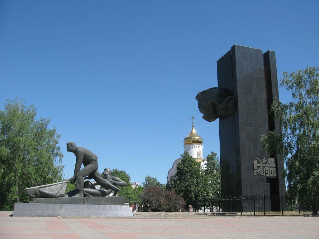 -СКУЛЬПТУРНАЯ ГРУППА: двухфигурная бронзовая композиция, символизирующая преемственность революционной борьбы: одна фигура – смертельно раненый падающий пожилой рабочий, другая – молодой рабочий, подхватывающий знамя, и установленная на низком трапециевидном постаменте; высота скульптурной композиции – 7 м; -ПАНТЕОН: расположение – позади скульптурной группы; квадратный в плане башнеобразный объем, состоящий из четырех пилонов, поставленных близко, но не вплотную, с щелевидными вертикальными проемами; в правом и левом пилонах – проходы внутрь, декоративные решетки; в верхней части пилона, обращенного к скульптурной группе, бронзовый пластичный элемент, символизирующий язык огня; на двух пилонах – золоченые композиции с цифрами 1905 или 1917, молотом и растительными листками; мозаика внутренних поверхностей пилонов, рисунок которой напоминает сполохи пламени, на внутренних сторонах каждого из пилонов соответственно: а) надпись: «Борцам Революции – вечная слава»; б) надпись: «Из искры возгорится пламя»; в) изображение рабочего, серпа и молота, цветки гвоздики и дата 1905; высота пантеона – 19 м., размер пламени – 7,5х4,5 м., размер рельефов – 3,75х9 м. -ПАМЯТНЫЙ ЗНАК: расположение – слева (на расстоянии около 40 м) от скульптурной группы; монолитный гранитный куб, установленный на месте братской могилы; на лицевой стороне надпись: «Жертвам расстрела антивоенной демонстрации Иваново-Вознесенских рабочих 10 августа 1915 г.» на боковой – имена расстрелянных рабочих.