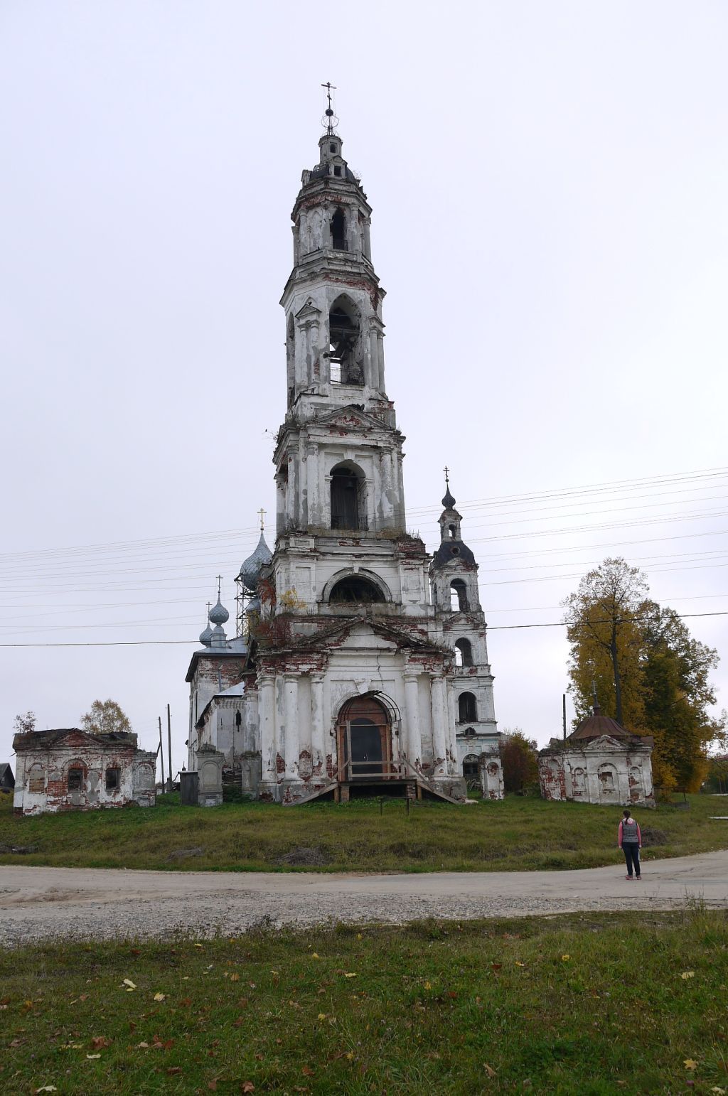 Объемно-пространственная структура объекта: градостроительное положение (расположена в западной части комплекса), план (квадратная в плане), композиция (столпообразная пятиярусная увенчана стройным световым барабанчиком, увенчанным главкой с крестом).Конструктивные особенности: материал конструкций (кирпич, дерево, фундамент бутовый); перекрытия (нижний ярус – восьмилотковый сомкнутый сводом), кровля (восьмигранный купол с люкарнами по сторонам света, металл); оконные и дверные проемы (форма, материал; композиция, количество, декор).Внешнее декоративное убранство: первый ярус и третий – треугольные фронтоны, имитирующие портики, с дорическими круглыми полуколоннами. Второй ярус прорезан полуциркулярными нишами, углы обрамлены пилястрами с ширинками. Два верхних яруса в плане восьмигранник, прорезаны вытянутыми стрельчатыми проемами, на диагональных гранях – такие же ниши. На четвертом ярусе на ниши наложены сдвоенные колонки с общим фронтоном. В верхнем ярусе колонками тосканского ордера отмечен каждый угол. Венчающая часть колокольни состоит из барочного вытянутого восьмигранного купола с люкарнами, на котором установлен световой барабанчик, несущий вазу с крестом.
