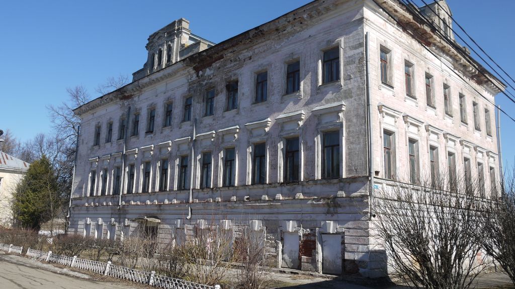 1. Местоположение: с северной стороны главной площади г. Родники.2. Объемно-пространственная композиция: трехэтажное прямоугольное в плане строение под вальмовой крышей, с аттиками на юго-восточном и юго-западном фасадах; общие габариты – около 18,5х32 м. 3. Внутренняя объемно-планировочная структура: коридорная с набором ячеек бывших комнат, некоторые из которых объединены в анфиладу.4. Конструкции и материалы: внутренние и наружные несущие стены из кирпича; аутентичные материалы главной лестницы; кровля – металлическая по деревянным наслонным стропилам.5. Архитектурная композиция фасадов:– главный фасад здания – юго-восточный, обращенный к пл. Ленина, с семью равномерно расставленными осями по фасаду; на юго-западном фасаде – двенадцать осей, смещенных в южную сторону; на северо-западном – пять осей, три из которых центральные сближены друг относительно друга; на северо-восточном фасаде – одиннадцать осей, седьмая слева – окно лестничной клетки, вход;– по осям поэтажно – прямоугольные оконные проемы; окна лестничной клетки более крупные, верхнее – вертикально вытянутое арочного завершения; первый этаж с крупным горизонтальным рустом, отделенный от двух верхних, имеющих имитацию уплощенного руста, карнизом; под окнами второго этажа – карниз; вверху фасадов – антаблемент; все окна в различного типа наличниках;– аттик юго-восточного фасада трехчастный, с высокой центральной частью арочного завершения с арочным чердачным окном и низкими боковыми частями с угловыми тумбами; аттик с юго-западной стороны трехчастный, с высокой центральной частью с четырехпилястровым портиком, завершенным в центре лучкового завершения фронтончиком на фоне прямоугольного парапета и низкими боковыми частями с угловыми тумбами; между пилястрами портика – арочные чердачные окна, по бокам высокой части – волюты.6. Элементы декоративного оформления фасадов:– стиль позднего классицизма;– наличники окон первого этажа рамочные, на юго-западном и юго-восточном фасадах – с веерными замками; наличники окон второго этажа рамочные, профилированные, с ушами, над ними – профилированные сандрики на фигурных кронштейнах; под сандриками – прямоугольные двухступенчатые неглубокие ниши; наличники окон третьего этажа рамочные, профилированные, с ушами, с клинчатыми замковыми камнями; межэтажный карниз упрощенный; подоконный карниз профилированный; под окнами второго этажа между карнизами – стойки на постаментиках под краями окон;– обрамление окон лестничной клетки с профилированными подоконниками единым мощным наличником арочного завершения портального типа вогнутого профиля, с профилированными периметрами, с замковым камнем на внутренней вогнутой части профиля наличника;– антаблемент с гладким фризом и широкой выносной плитой карниза с модульонами;– в аттиках – пилястры дорического ордера; в центральной части аттика юго-восточного фасада чердачное окно завершено архивольтом с замковым камнем, по его сторонам – пилястры с филенками, соединенные в вершинах архивольтом с замковым камнем; чердачные окна аттика юго-западного фасада завершены архивольтами с замковым камнем.– историческая форма оконных рам.7. Элементы убранства интерьеров:– парадная лестница с аутентичными ступенями и литыми металлическими плоскими балясинами; в окнах 