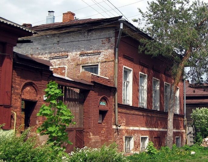 объемно-пространственная структура объекта: градостроительное положение (расположен в северо восточной части города, главным фасадом выходит на красную линию улицы, план здания - прямоугольник,композиция - кирпичное, не оштукатуренное здание, этажность - одноэтажное с полуподвалом и антресолями зданиям;конструктивные особенности: материал конструкций - кирпич, дерево, оконные проемы - форма - прямоугольник, в полуподвале близкие к квадрату, геометрия рисунка переплета, кровля - пологая, вальмовая, материал покрытия - железо, входной тамбур - композиция - центр западного бокового фасада;внешнее декоративное убранство: цокольный этаж, форма - простая,материал кирпич,композиция проходит по периметру здания, наличие оконных проемов, междуэтажный пояс, форма - многоступенчатая, материал - кирпич, сандрики, форма - ступенчатые, материал - кирпич, композиция - окна первого этажа, информационная надпись, форма - прямоугольник, текст \" В этом доме прошло детство и юность Константина Бальмонта русского поэта (1867-1942)ворота, калитка, ограда, забор: градостроительное положение (выходят на красную линию улицы),композиция - по сторонам проезда ворот два пилона с калитками, материал - кирпич, дерево, проемы, форма - прямоугольник с арочным завершением.