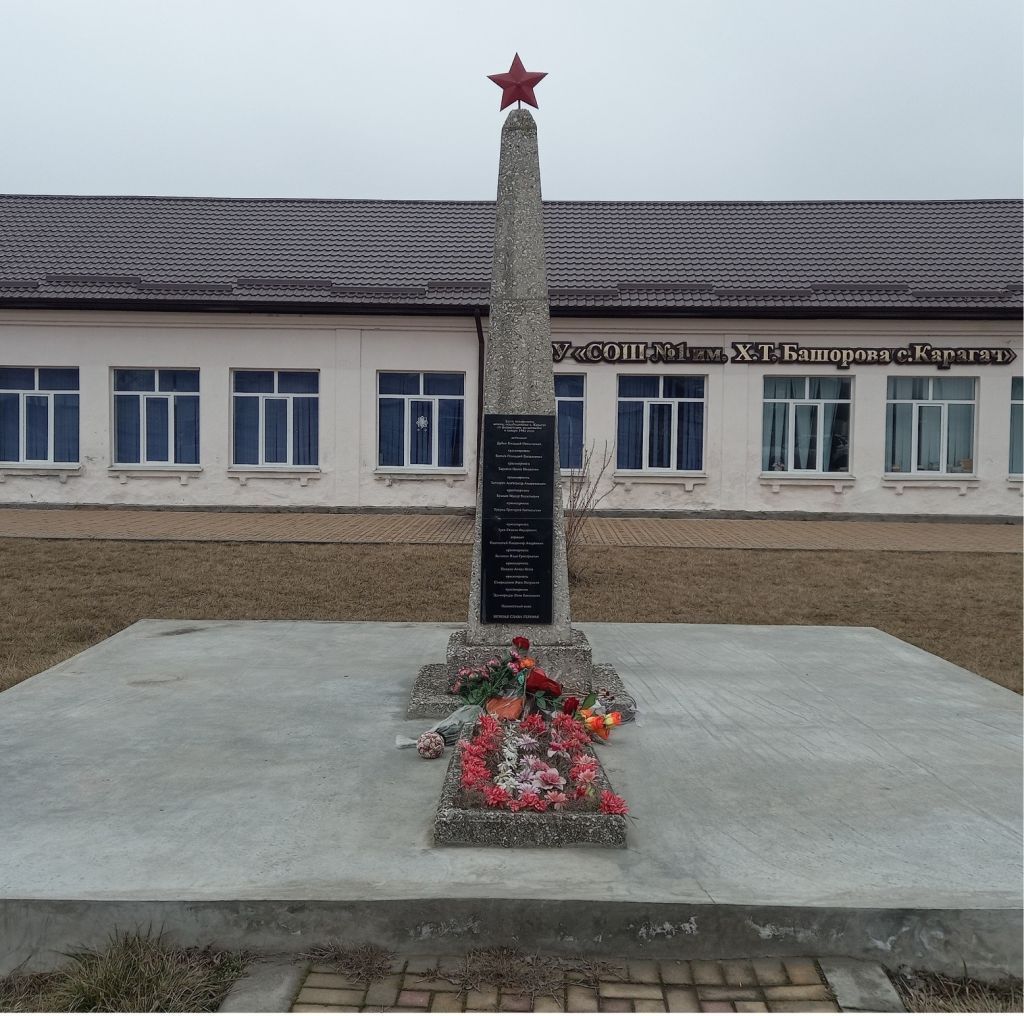 Предметом охраны объекта культурного наследия регионального значения «Памятник Дубову и 12 другим воинам, погибшим в годы Великой Отечественной войны», расположенного по адресу: Кабардино-Балкарская Республика, Прохладненский муниципальный район, с.п. Карагач, ул. Абубекирова, 98, территория средней общеобразовательной школы, являются:1)части градостроительной характеристики:местоположение памятника, участвующего в формировании панорамы села;2)в части объемно-пространственной и планировочной композиции:планировочное решение территории,габариты и силуэт памятника,беспрепятственный полный круговой набор видовых раскрытий;3)в части конструктивного решения:обелиск,постамент,цветник,пьедестал, необходимый для видовых раскрытий,дорожка;4)в части художественного оформления:обелиск квадратного сечения, сужающийся кверху, каменная плита из черного мрамора с мемориальной надписью: «Здесь похоронены воины, освобождавшие с. Карагач от фашистских захватчиков в январе 1943 года», звания, фамилии, имена и отчества погибших 12 воинов, неизвестное одно захоронение, пятиконечная звезда, изготовленная из металла,двухступенчатый постамент квадратного сечения, изготовленный из бетона с мраморной крошкой,цветник прямоугольной формы, изготовленный из бетона с мраморной крошкой, устроенный перед обелиском на пьедестале,пьедестал квадратной формы из бетона,дорожка, вымощенная цветной тротуарной плиткой.