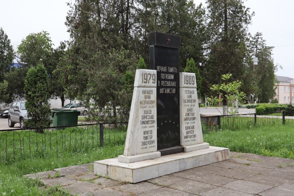1. Градостроительная охрана1.1Расположение памятника и основная точка восприятия в западо-северо-западном направлении. (фото)1.2Основная точка восприятия в западном направлении (фото)1.3Основная точка восприятия в востоко-юго-восточном направлении (фото)1.4Основная точка восприятия в юго-восточном направлении (фото)2. Архитектурная охрана (экстерьер) 2.1Объемно-пространственное решение — Три гранитные стелы с надписями установленные на бетонный постамент (фото) 2.2Характер архитектуры главных фасадов:2.2.1- композиция – памятник в форме трех гранитных мемориальных плит, установленных на бетонный стилобат, облицованный гранитными плитами (фото)2.2.2- фрагмент памятника – центральная стела выполненная из черного гранитного камня (фото)Надпись «Вечная память погибшим в Республике Афганистан» (фото)2.2.3- фрагмент памятника – мемориальная доска из цельного гранита (фото)Надпись со списком имен погибших: (фото)1979Накацев Юрий Музракович 20.09.1963-29.12.1982Ходов Вячеслав Тимофеевич 11.10.1963-01.08.1983Иригов Виктор Зуберович 16.05.1965-25.06.19842.3.4- фрагмент памятника – мемориальная доска из цельного гранита (фото)Надпись со списком имен погибших: (фото)1989Гетежев Алик Хасанбиевич 23.02.1968-06.01.1988Дуков Ахметхан Амирханович 19.02.1968-14.02.1988Варитлов Алексей Амирханович 05.05.1968-25.06.1988