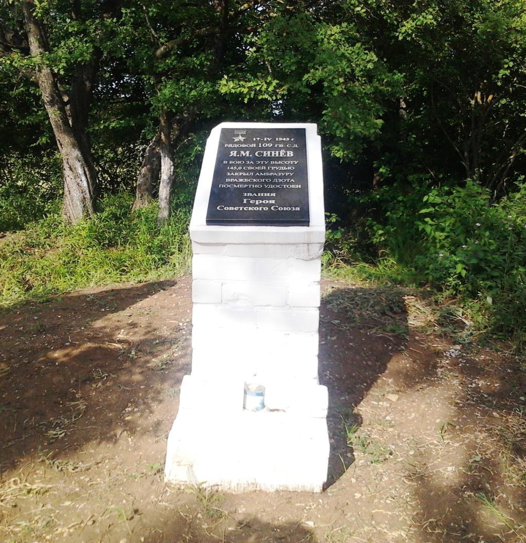 Высота 145,4, где рядовой Я.М. Синяев закрыл своим телом амбразуру дзота фашистов. За этот подвиг Я.М. Синяеву присвоено звание Героя Советского Союза