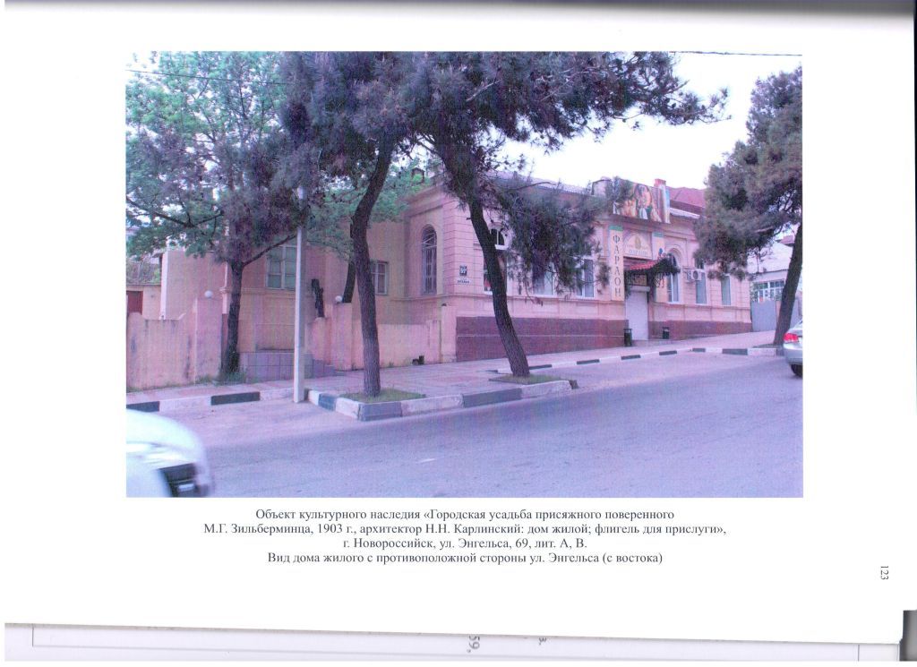 Предметом охраны объекта культурного наследия регионального значения «Городская усадьба присяжного поверенного М.Г. Зильберминца, 1903 г., архитектор Н.Н. Карлинский: дом жилой; флигель для прислуги», г. Новороссийск, ул. Энгельса, 69, лит. А, В являются: Усадьба:а) планировочные характеристики- располагается в исторической части города Новороссийска;- усадьба сохранилась в своих исторических границах;- вдоль улицы Энгельса подлинное высокое каменное ограждение;б) объемно-пространственные характеристики- строения усадьбы выстроены параллельно друг другу, что обеспечивает их благоприятное зрительное восприятие со всей территории участка;- со стороны улицы строения воспринимаются единым ансамблем благодаря их высотным характеристикам: одноэтажный жилой дом выстроен на фоне двухэтажного флигеля;в) архитектурно-стилистические характеристики- жилой дом: одноэтажное прямоугольное в плане здание своим главным фасадом развернуто по красной линии ул. Энгельса. В эклектичном архитектурном убранстве фасадов присутствует стилистический набор псевдоклассицизма;- флигель для прислуги: двухэтажное прямоугольное в плане здание располагается в глубине участка, своим главным фасадом развернуто в сторону жилого дома. В эклектичном архитектурном убранстве фасадов присутствует стилистический набор модерна;г) исторические ценностные характеристики:- усадьба присяжного поверенного М.Г. Зильберминца;- усадьба, построенная архитектором Н.Н. Карлинским, 1903 г.Дом жилой:а) градостроительные характеристики- элемент фронта исторической застройки ул. Энгельса;- композиционное ядро в структуре культурного ландшафта квартала;- главный элемент участка застройки;б) архитектурные и конструктивные характеристики- одноэтажное прямоугольное в плане здание;- стилистическое решение – псевдоклассицизм;- симметричный главный фасад раскрепован рустованными лопатками на три части: центральная с дверным проемом, боковые в три оконных проема;- оконные проемы северного и восточного фасадов арочной циркульной конфигурации с архивольтами; оконные проемы южного (дворового) фасада прямоугольной конфигурации;г) исторические ценностные характеристики:- дом жилой присяжного поверенного М.Г. Зильберминца;- усадьба, построенная архитектором Н.Н. Карлинским, 1903 г.Флигель для прислуги:а) градостроительные характеристики- ценный элемент в структуре культурного ландшафта квартала;- второстепенный элемент участка застройки;б) архитектурные и конструктивные характеристики- двухэтажное с чердачным этажом прямоугольное в плане здание;- эклектичное решение оформления фасадов с преобладанием стилистических особенностей модерна;- оконные проемы прямоугольной конфигурации, на втором этаже обрамлены наличниками;г) исторические ценностные характеристики:- флигель для прислуги присяжного поверенного М.Г. Зильберминца;- усадьба, построенная архитектором Н.Н. Карлинским, 1903 г.