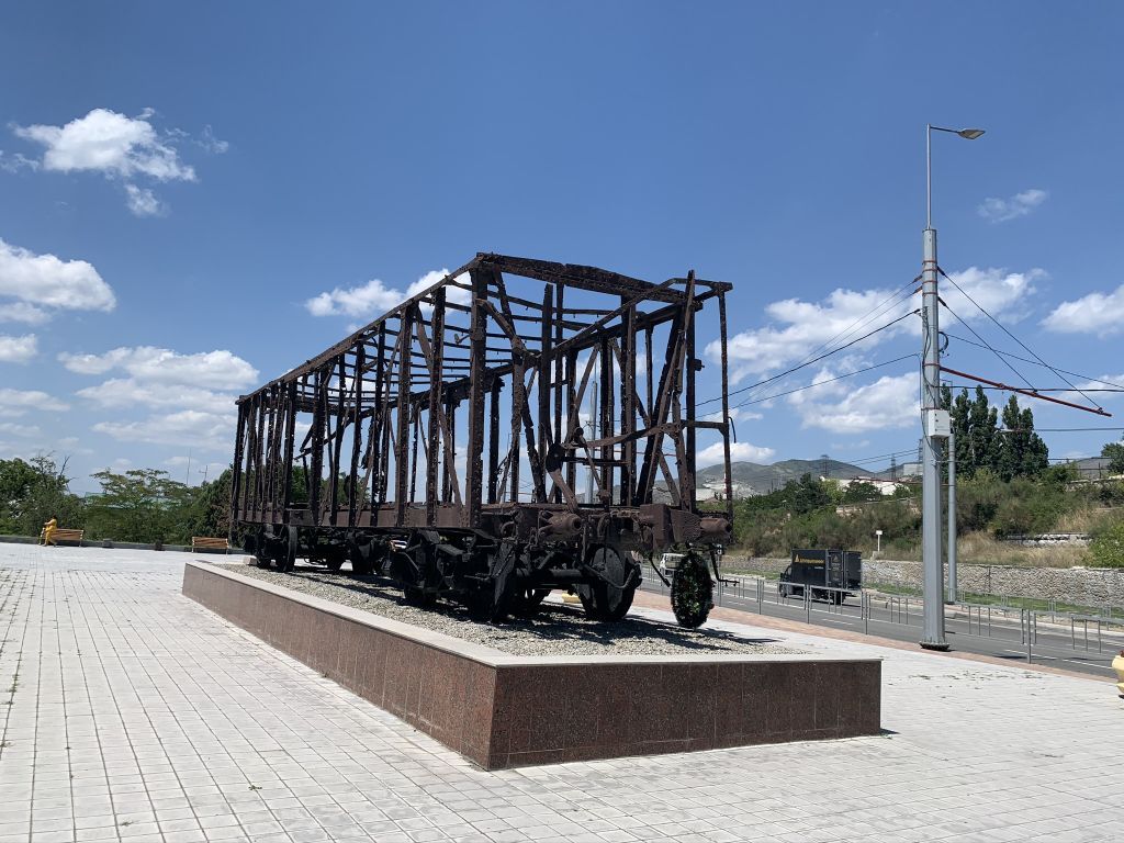 Железнодорожный вагон, стоящий на месте ожесточенных боев частей Советской Армии и Черноморского флота с немецко-фашистскими захватчиками