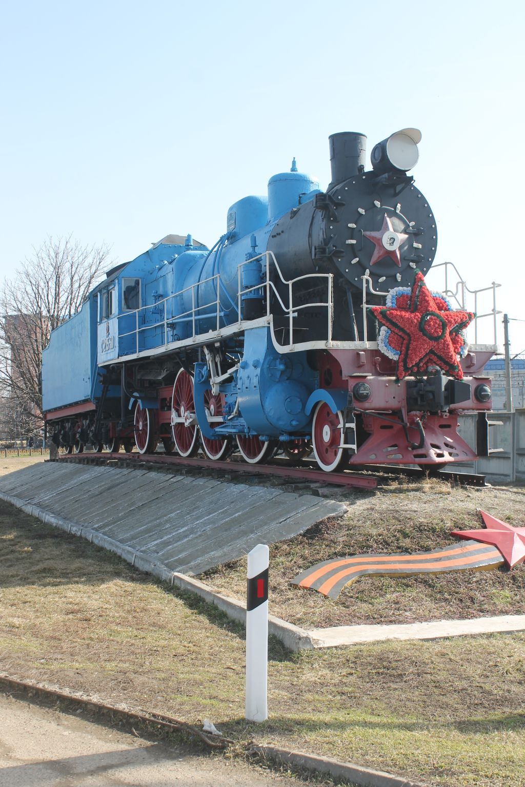 Паровоз СУ-215-50 ("Голубой локомотив"), установленный в честь трудовых подвигов ремонтников локомотивного депо в годы Великой Отечественной войны