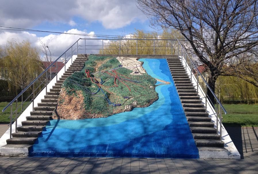 Местоположение памятника. 2. Габариты, силуэт памятника. 3. Объемно-пространственная композиция, в том числе:ландшафтное мозаичное панно с обозначением мест расположения и продвижения воинских частей и соединений, принимавших участие в защите и освобождении города от немецко-фашистских захватчиков; материал карты ¬¬– смальтовая мозаика голубого, зеленого, коричневого и белого цвета;железобетонная подпорная стена макета карты – схемы;железобетонная смотровая площадка на верхней отметке ландшафтного панно;два 27-ми ступенчатых лестничных марша;металлическое ограждение.4. Планировочное решение территории Памятника, расположенного на одной площадке с объектами культурного наследия регионального значения «Памятник «Взрыв», а также «Календарь апрельских боев», 1943 г.