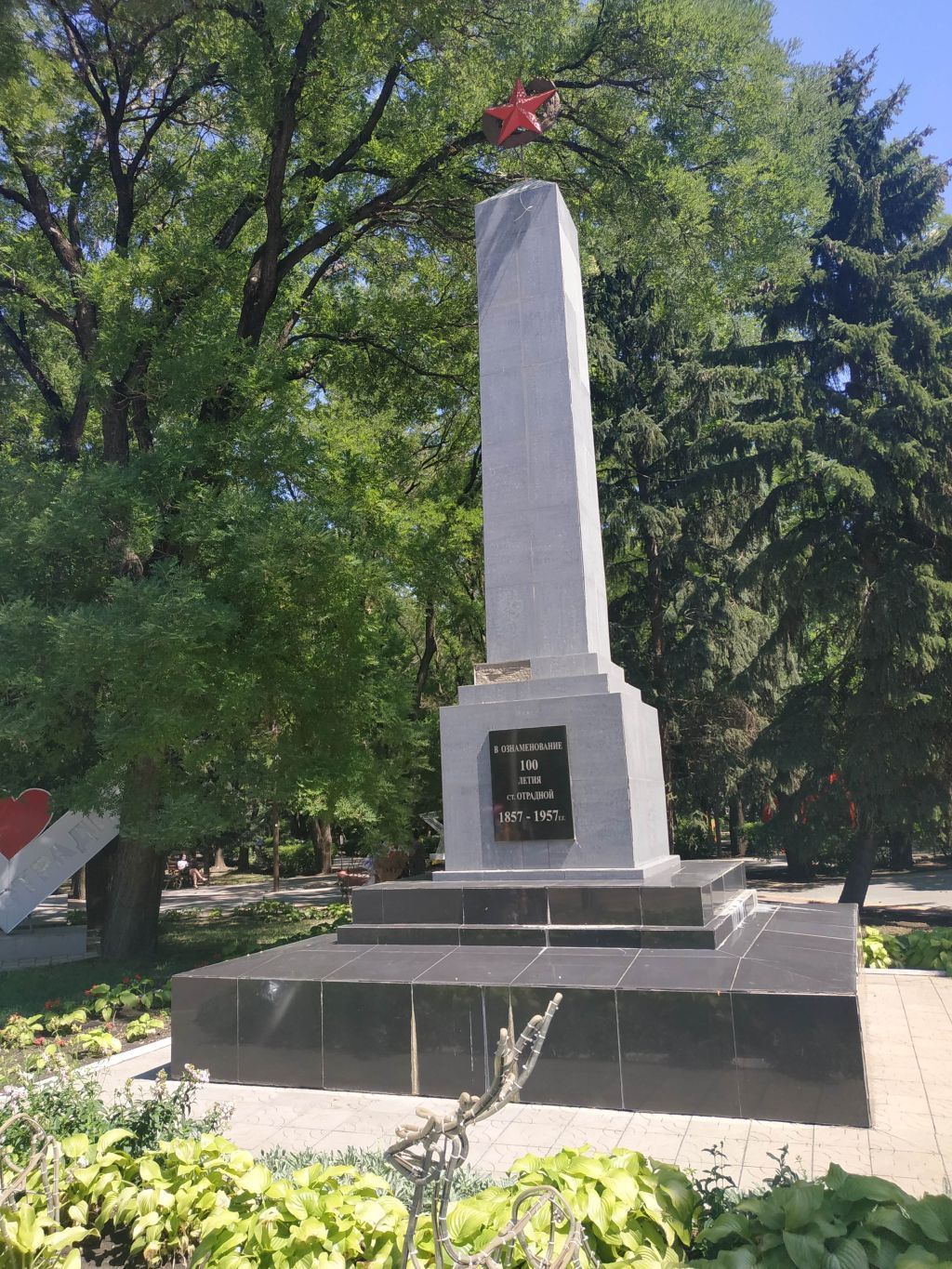 Градостроительные характеристикиЗначимый элемент композиционно-пространственной структуры ст-цы Отрадной Отрадненского района Краснодарского края. Местоположение на земельном участке площадью 54700 м2 с кадастровым номером 23:23:0505215:94 по улице Красной 67 «д». Месторасположение в северо-восточной части парка Софора, на пересечении улиц Первомайской и Красной ст-цы Отрадной.Архитектурные характеристикиГабаритные размеры 1,75м*1,75м*13м(h), конфигурация и объемно-пространственное решение памятника: четырехгранный обелиск, установленный на квадратный постамент, размещенный в центре ступенчатого стилобата квадратной конфигурации в плане. Венчающие обелиск металлическая пятиконечная красная звезда и обрамляющий ее лавровый венок. Мемориальная табличка из натурального камня, установленная на лицевой грани постамента. Бетонный лавровый венок, обрамляющий мемориальную табличку. Текст мемориальной надписи: «В ознаменование 100-летия ст. Отрадной 1857-1957 гг.». Историческая ценностьПодлинный элемент материальной культуры, связанный с юбилейными событиями, посвященными 100-летию образования станицы Отрадной.