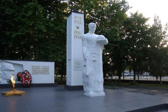 Градостроительные характеристики:элемент композиционно-планировочной структуры парка; расположение в западной части парка, около двенадцати метров от дорожного полотна улицы Советской;ориентация элементов мемориального комплекса на северо-восток.Объемно-пространственные и планировочные характеристики:объемно-пространственная композиция мемориального комплекса:братское захоронение двенадцати воинов, погибших в годы гражданской и Великой Отечественной войн;площадка над захоронением, с тремя ступенями с северо-востока;стена с рельефом и памятной надписью, расположенная в юго-западной части бетонной площадки;чаша с вечным огнем в центральной части бетонной площадки, расположенная с северо-востока по оси бетонной стены;стела с памятными надписями в центральной части площадки, расположенная с северо-запада по оси чаши с вечным огнем;скульптура солдата, расположенная с северо-востока по оси стелы;высотные и объемно-планировочные характеристики памятных знаков мемориального комплекса (площадка, стена с рельефом и памятной надписью, чаша с вечным огнем, стела с памятными надписями, скульптура) и их частей;конфигурация и габариты памятных знаков мемориального комплекса (площадка, стена с рельефом и памятной надписью, чаша с вечным огнем, стела с памятными надписями, скульптура) в пределах исторических конструкций.Конструктивные характеристики:материалы, конструкции, декоративная обработка памятных знаков мемориального комплекса (площадка, стена с рельефом и памятной надписью, чаша с вечным огнем, стела с памятными надписями, скульптура): бетон с отделкой.Композиционное и архитектурно-художественное решение памятных знаков:квадратная в плане площадка с тремя ступенями с северо-востока;прямоугольная стена на цоколе, с барельефом, изображающим три портрета в профиль: отец, сын-солдат и красноармеец. На стене рельефная надпись: «Вечная слава героям, павшим в боях за свободу и независимость нашей Родины»;чаша с вечным огнем на квадратном в плане постаменте;квадратная в плане стела на цоколе, с памятными надписями: «1918», «1922», рельефная пятиконечная звезда, «1941», «1945», «Здесь похоронены участники Гражданской и Великой Отечественной войн»;памятные знаки мемориального комплекса (площадка, стена с рельефом и памятной надписью, чаша с вечным огнем, стела с памятными надписями) – работа архитектора Чайка Г.М.;скульптура солдата в полный рост в солдатской экипировке и обнаженной, опущенной головой; с каской в левой согнутой руке и автоматом в опущенной правой руке. Особенность внешности – усы и зачесанные на левый бок волосы с пробором. Снизу имитация врезки скульптуры в неотесанный камень. Скульптура расположена на квадратном в плане постаменте. Характеристики, параметры и материальные элементы, непосредственно связанные с мемориальным периодом:братское захоронение;объект материальной культуры, созданный для увековечения памяти воинам-односельчанам, погибшим в годы гражданской и Великой Отечественной войн.Предмет охраны может быть уточнен на основании комплексных научных исследований в процессе подготовки научно-проектной документации по сохранению объекта культурного наследия.