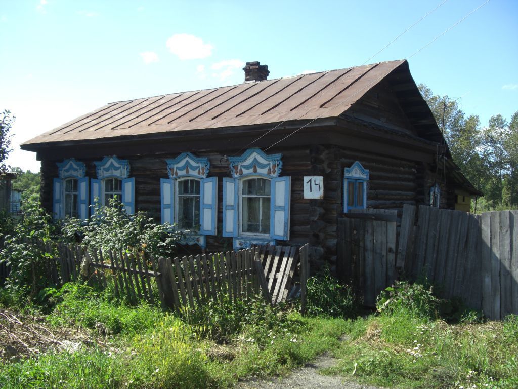 Деревянный жилой дом конца XIX века со своеобразным резным декором на мотив "солнышко" по фронтону и пропильной резьбой карнизов
