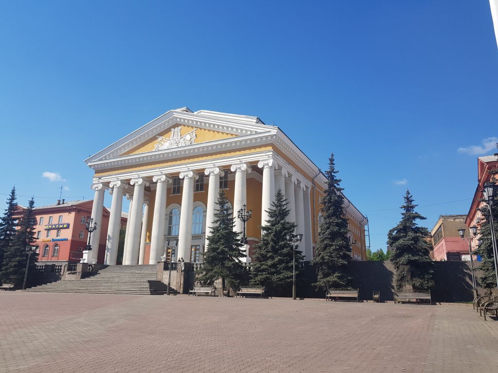 1.Местоположение т гадостроительные характенристики здания в застройке:- доминирующая роль в композиционно-планировочной структуре квартала;-здание композиционно формирует площадь - курдонер и силуэт застройки пр. Шахтеров.2. Объемно-пространственная композиция здания середины XX века:-центрально-осевая композиция прямоугольного объема; -восточный (главный) фасад, формирующий курдонер с пр. Шахтеров, центрально-осевая неоклассическаякомпозиция с выступающим портиком;-северный и южный фасады: рядовая композиция;-западный фасад, замыкающий террасы эспланады,центрально-осевая неоклассическаякомпозиция с лоджией и колоннадой и выступающим объемов сценической коробки;_-конструкции и материал наружных капитальных стен (гладкая штукатурка по кирпичной кладке);-габариты по существующему плану и высоте объемов здания;- подлинные несущие внутренние железобетонные конструкции стен, перекрытий, колонны;-отметки и форма кровли объемов здания;-отделка фасадов - штукатурка с последующей окраской, архитектурные детали - выделены белым цветом.3.Композиция и архитектурно-художественное оформление восточного фасада здания середины XX века:-местоположение, форма дверных и оконных проемов,исторический рисунок и расстекловка оконныхзаполнений;-восьмиколонный портик в глубину на четыре колонны и пилястру на высоком стилобате;колонны композитного ордера с ионическими капителями;треугольный фронтон в обрамлении тянутого профилированного карниза с поясом из дентикул;-тимпан фронтона оформлен барельефом лепного декора - композиция из музыкальных инструментов с арфой;-балки архитрава портика оформлены прямоугольными ширинками в рамку;-центральный ризалит (входной вестибюль) на три оси, выделен входными порталами, арочными оконными проемами второго этажа, прямоугольными оконными проемами третьего этажа;-раскрепованный карниз ризалита по внутреннему периметру портика и центрального ризалита, фриз оформлен растительным барельефом;прямоугольный наличник портала с ушками, декорирован цветочными розетками;-архивольты арочных оконных проемов, рамка со сдвоенными полуколоннами коринфскими капителями опирается на подоконный карниз на кронштейнах фланкирующих наличник портала;-подоконная ниша с балюстрадой;-поле архивольта оформлено лепным декором из розеток и аканта;-заполнение и рисунок двухстворчатых дверей с верхней остекленной фрамугой;-терраса стилобата с ограждением из балюстрады.4.Композиция и архитектурно-художественное оформление южного и северного фасадов здания середины XX века:-местоположение, форма дверных и оконных проемов,историческии рисунок и расстекловка оконных заполнений;-развитый профилированный карниз с поясом из ступенчатых дентикул;-архивольт арочного оконного проема на два этажа, рамка со сдвоенными полуколоннами, коринфскими капителями, подоконный карниз, ниша с балюстрадой;-прямоугольные оконные проемы с подоконными карнизами;-рустованный цокольный этаж с межэтажным карнизом;-боковые выходы с крыльцами, дверной портал на два этажа оформлен прямоугольным наличником с ушками, декорирован прямоугольным сандриком на кронштейнах.-крыльцо с шарами и лучковым проемов;тамбур запасного выхода с раскрепованным межэтажным карнизом, треугольный фронтон на поле парапета.5.Композиция и архитектурно-