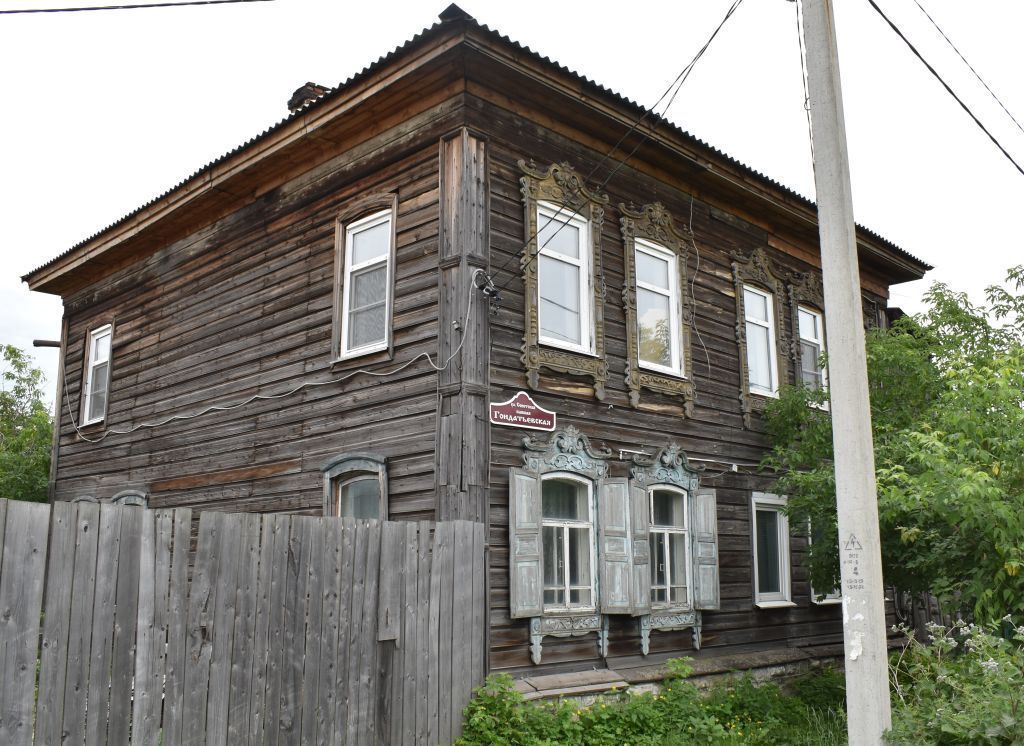 Общий объем: объемно-планировочное решение в габаритах капитальных конструкций - сруб-шестистеной, под обшивку, с входным прирубом на два этажа (без фундамента); первоначальные высотные отметки; крыша - четырехскатная. Материал исполнения: стены - бревенчатые «в лапу» без остатка, с горизонтальной обшивкой. Композиция: фронтальная композиция фасадов габаритные размеры, пропорции, количество оконных проемов): главный фасад формирует линию застройки ул. Советской на пять оконных осей. Стилеобразующие элементы архитектурного оформления фасадов: декоративное оформление оконных проемов: l-й этаж: лучковые проемы, наличники с барочными сандриками (встречные валюты с декоративной раскреповкой в виде двух птичек, держащих цветок над солярным знаком); поле лобовой и фигурной подоконной доски оформлено накладным декором растительного орнамента; резные детали завитков в виде ушек фиксируют плечики сандрика, двухстворчатые филенчатые ставни; 2-й этаж: лучковые проемы, наличники с барочными сандриками (встречные валюты с декоративной раскреповкой в виде двух птичек, держащих цветок над солярным знаком); поле лобовой и фигурной подоконной доски оформлено накладным декором растительного орнамента; вертикали наличника декорированы точеными полуколонками; точеные и резные детали завитков в виде ушек фиксируют плечики сандрика; фриз на две горизонтальные профилированные доски; карниз на три профилированные доски; поле фасада обшито горизонтальной профилированной доской; углы сруба по обшивке оформлены в виде лопаток, декорированы накладными вертикальными филенками; первоначальная расстекловка оконных проемов; сени прируба - горизонтальная обшивка, дверной проем: двухстворчатые филенчатые полотна; цветовое решение на контрасте между основным объем (темного цвета) и декоративными деталями (светлые тона).