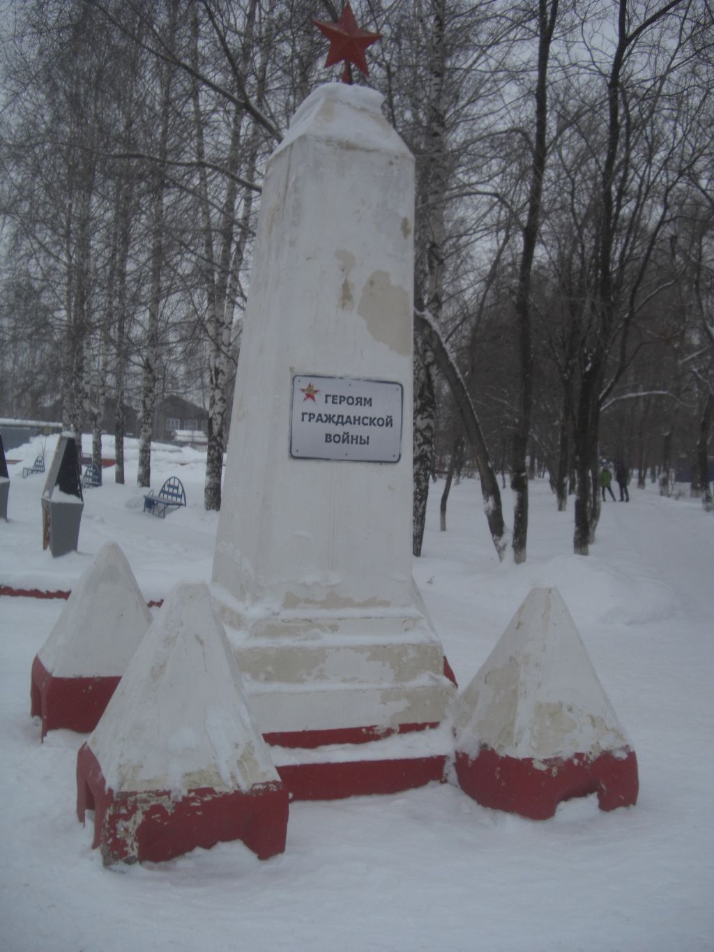 Местоположение и градостроительные характеристики объекта: Памятник композиционно замыкает архитектурно-градостроительную ось городского сада и мемориального ансамбля. Является визуальным ориентиром в панораме застройки ул. Революции. Пространственно организует северо-западную часть городского сада. Объемно-пространственная композиция монумента: Симметричная композиция. В центре композиции обелиск в виде усеченной пирамиды. Трехступенчатый постамент. Квадратный в плане одноступенчатый стилобат. Но углам центральной композиции четыре пирамидальных объема. Пятиконечная звезда, завершающая обелиск. Конструкции и материал облицовки памятника. Габариты по существующему объему и высоте. Композиция и архитектурно-художественное оформление монумента: Обелиск (высота 3,5 м) – монолитный железобетон, окрашен краской белого цвета. Постамент – монолитный железобетон, окрашен краской белого цвета. Стилобат - монолитный железобетон, окрашен краской красного цвета. Пирамидальные объемы (0.8 м х 0.8 м х 1.2 м) - монолитный железобетон, окрашены краской белого цвета. Основания пирамидальных объемов окрашены краской красного цвета. Пятиконечная звезда из металла, окрашена краской красного цвета. Табличка на лицевой стороне обелиска с текстом: «Героям Гражданской войны». Благоустройство по периметру памятника, мощение пешеходных дорожек тротуарной плиткой. Функциональное использование мемориала.