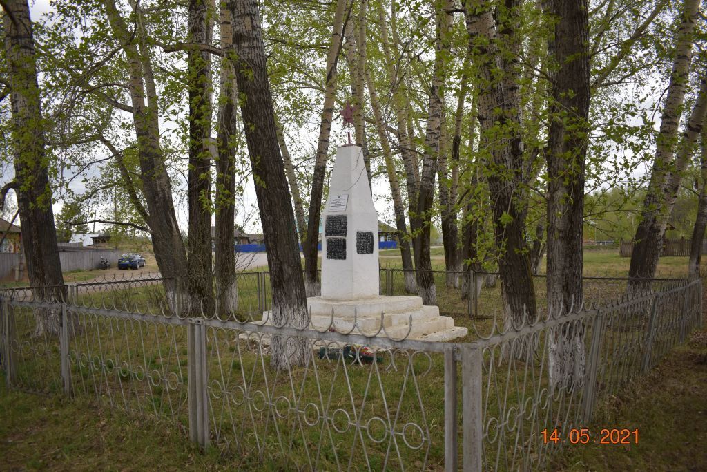 1. Захоронение.2. Композиционное и пространственное решение памятника.3. Габариты и объем памятника:- ограждение (7,0×5,0 м);- трехступенчатый стилобат (I - 3,0×3,0×0,15 м; II - 2,6×2,6×0,2 м; III - 2,2×2,2×0,2 м);- основание (1,8×1,8×0,2 м.);- обелиск (0,74×0,74×2,7 м);4. Конструктивные элементы, материал памятника:- ажурное ограждение – метал;- основание – бетон;- обелиск в виде четырехгранной усеченной пирамидой – бетон;- стилобат – бетон.5. Декоративные элементы памятника:- металлическая красная пятиконечная звезда наверху обелиска. 6. Содержание информационных надписей на 4-х металлических мемориальных табличках:- на главном фасаде: «25-26 октября 1918 г. колчаковскими карателями были расстреляны участники Чумайского восстания за власть Советов»; - на остальных 3-х помещено 19 фамилий: Пересыпкина Д.С., Ачкасов В.А., Ачкасов П.В., Ачкасов Н.Н., Алексеенко А.В., Буланаков В.Н., Давыдов С.М., Пересыпкин И.П., Пожидаев Д.И., Смоляников П.Е., Трухницкий, Шубин Г.Н., Шолданов Е., Золотарев И.А., Лазарев А.А., Мичурин Ф.А., Морозов М.С., Носков В.М., Носков В.П.