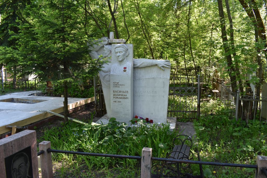 1.Захоронение. 2.Местоположение: - кладбище. 3.Габариты и объем памятника. 4.Материал исполнения: - стела с горельефом - бетона с мраморной крошкой; - стела с барельефным изображением бюста И.Р. Васильева - белый мрамор. 5. Содержание информационных надписей: - на стеле из бетона: «Герой Советского Союза Васильев Илларион Романович 20.Х.1910-5.Х.1969»; - на стеле из белого мрамора: «Герой Советского Союза Васильев Илларион Романович 1910-1969».