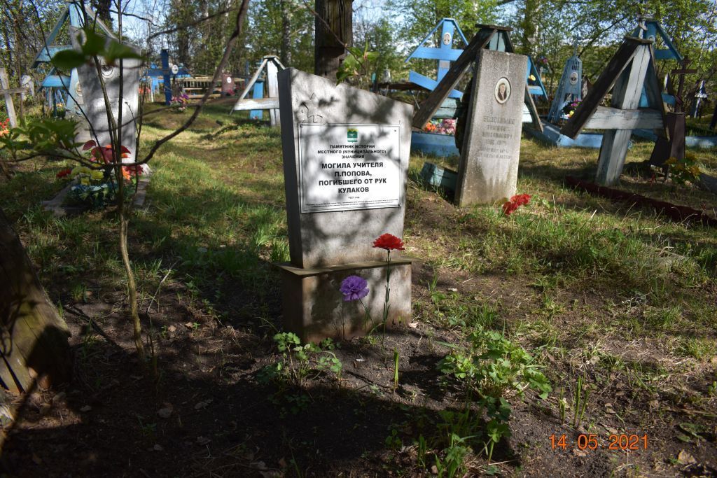 1. Захоронение.2. Композиционное и пространственное решение памятника.3. Габариты и объем памятника:- постамент (0,2×0,6×0,4 м);- стела (0,1×0,54×0,8 м).4. Конструктивные элементы, материал памятника:- четырех угольный постамент - метал;- стела - метал.5. Декоративные элементы памятника:- объемная металлическая пятиконечная звезда в левом верхнем углу стелы. 6. Содержание информационной надписи на металлической пластине в центре лицевой грани стелы: «Первый учитель Попов Павел погиб 20.10.1921 г. от рук злоумышленников».