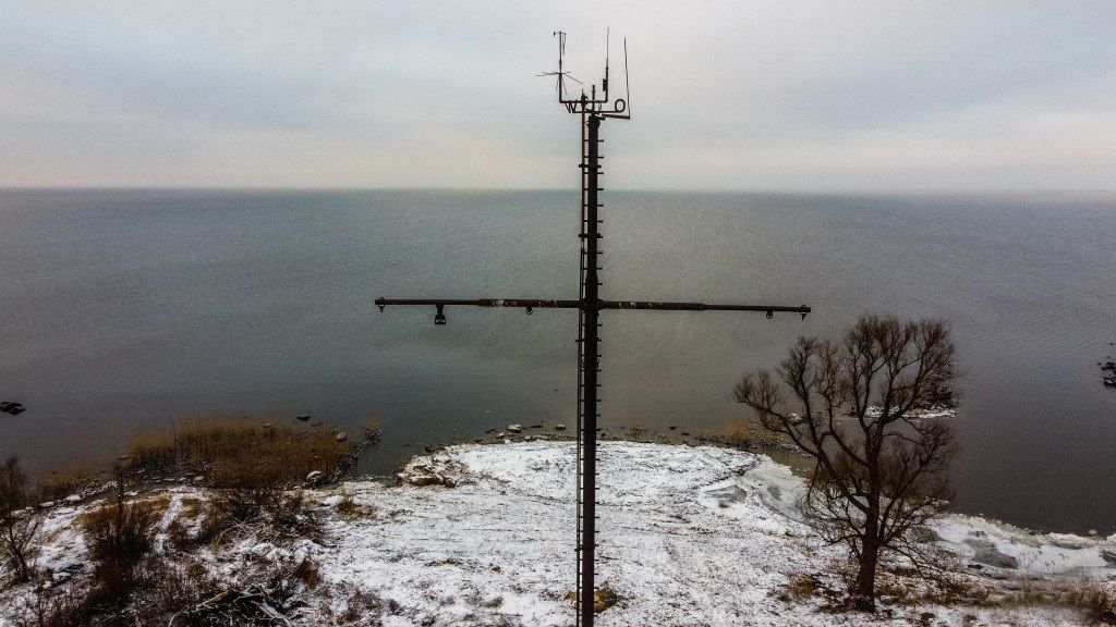 Местоположение металлического столба из стали высотой порядка 8 метров, исторические высотные габариты, структура и материал конструктивных элементов в части заглубленного основания с диаметром сечения около 200 миллиметров, а также четырех растяжек радиусом крепления около 2,0 метров и горизонтальных стальных балок трубчатой конструкции, закрепленных на высотных отметках мачты.